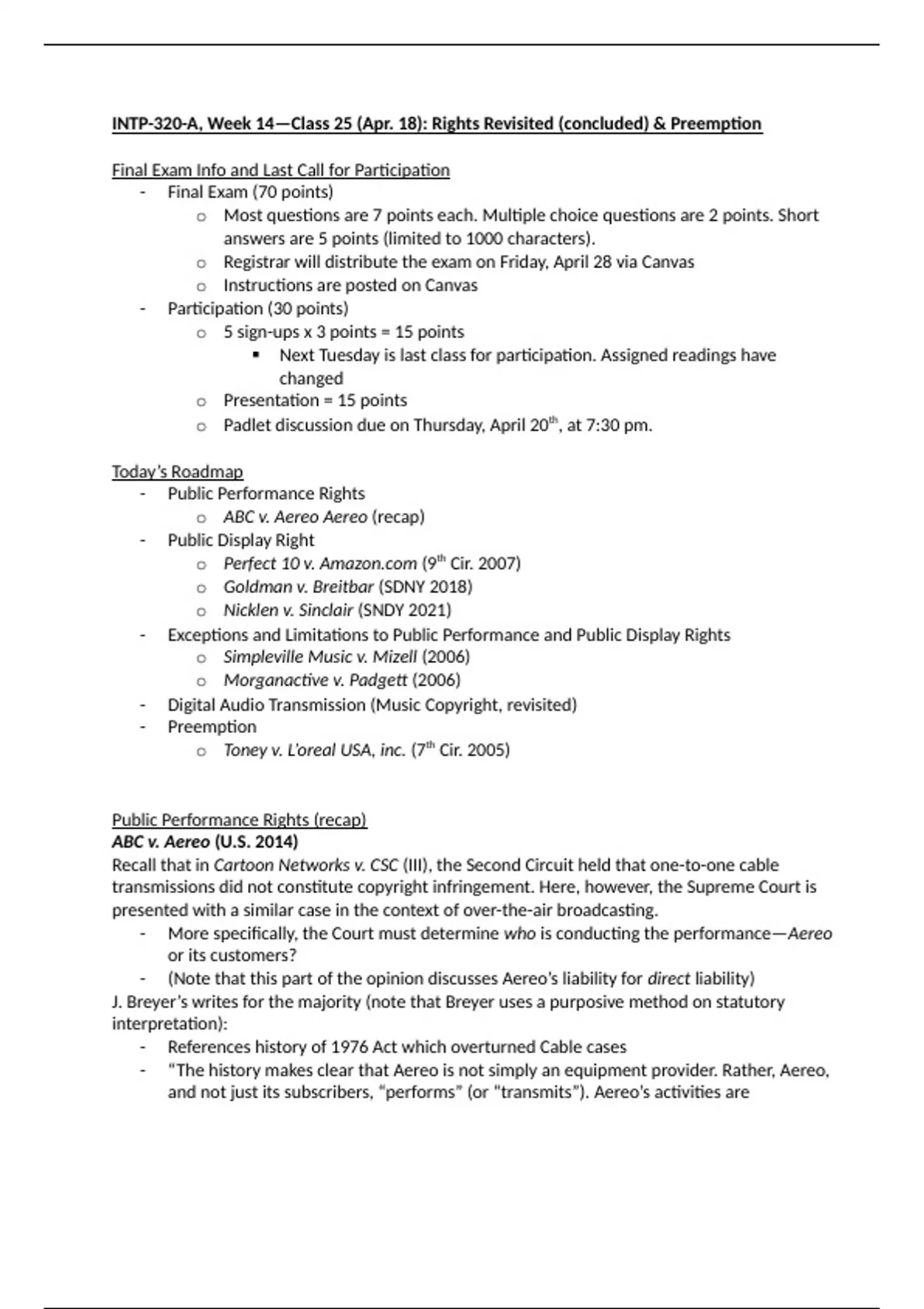 INTP-320 Copyright Law Class 25 (Public Performance & Display Rights, Preemption)