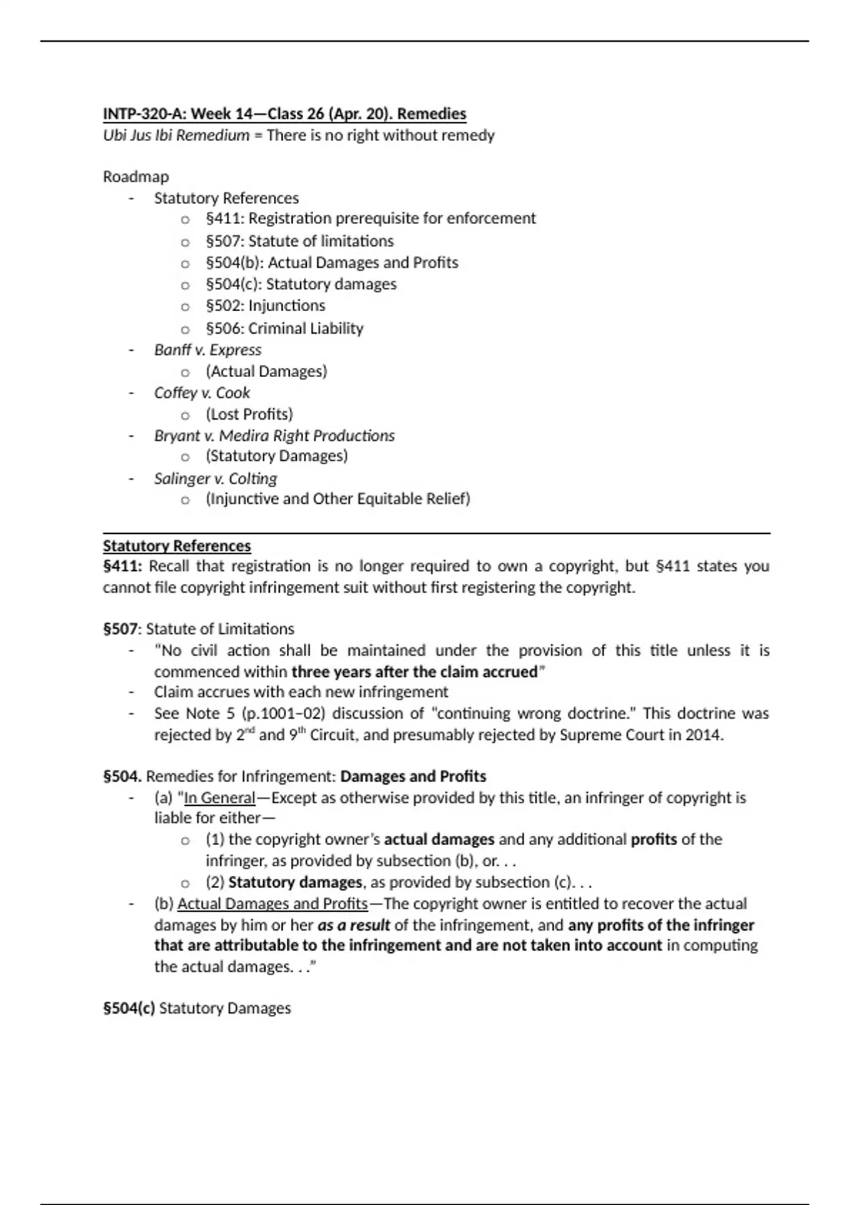 Statute of limitations, actual damages and profits, statutory damages, injunctions, criminal penalties