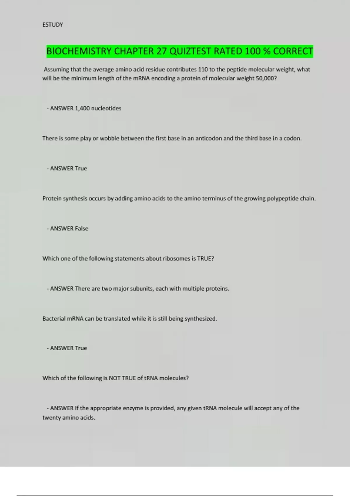 BIOCHEMISTRY CHAPTER 27 QUIZTEST RATED 100 % CORRECT