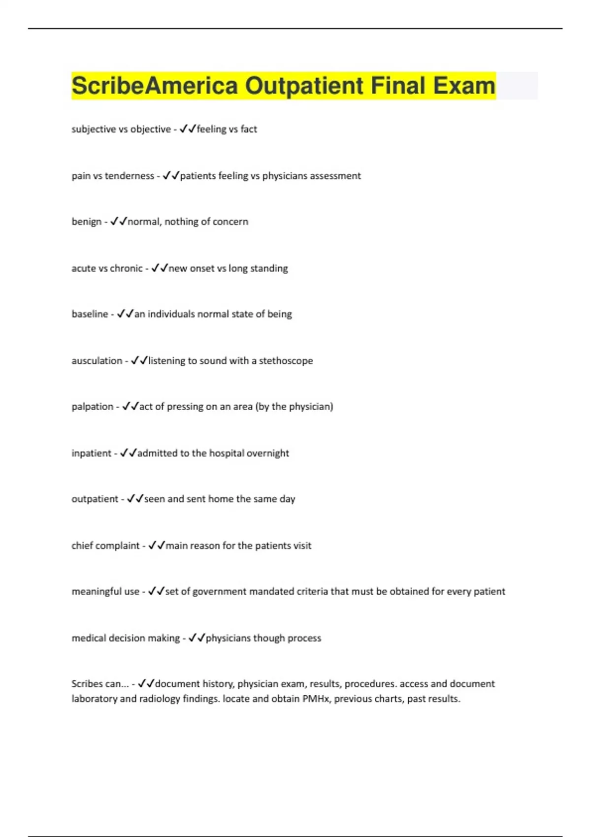 subjective vs objective - feeling vs fact pain vs tenderness - patients feeling vs physicians assessment benign - normal, nothing of concern acute vs chronic - new onset vs long standing baseline - an individuals normal state of being ausculation - listening to sound with a stethoscope palpation - act of pressing on an area (by the physician) inpatient - admitted to the hospital overnight outpatient - seen and sent home the same day chief complaint - main reason for the patients visit meaningful use - set of government mandated criteria that must be obtained for every patient medical decision making - physicians though process Scribes can... - document history, physician exam, results, procedures. access and document laboratory and radiology findings. locate and obtain PMHx, previous charts, past results.