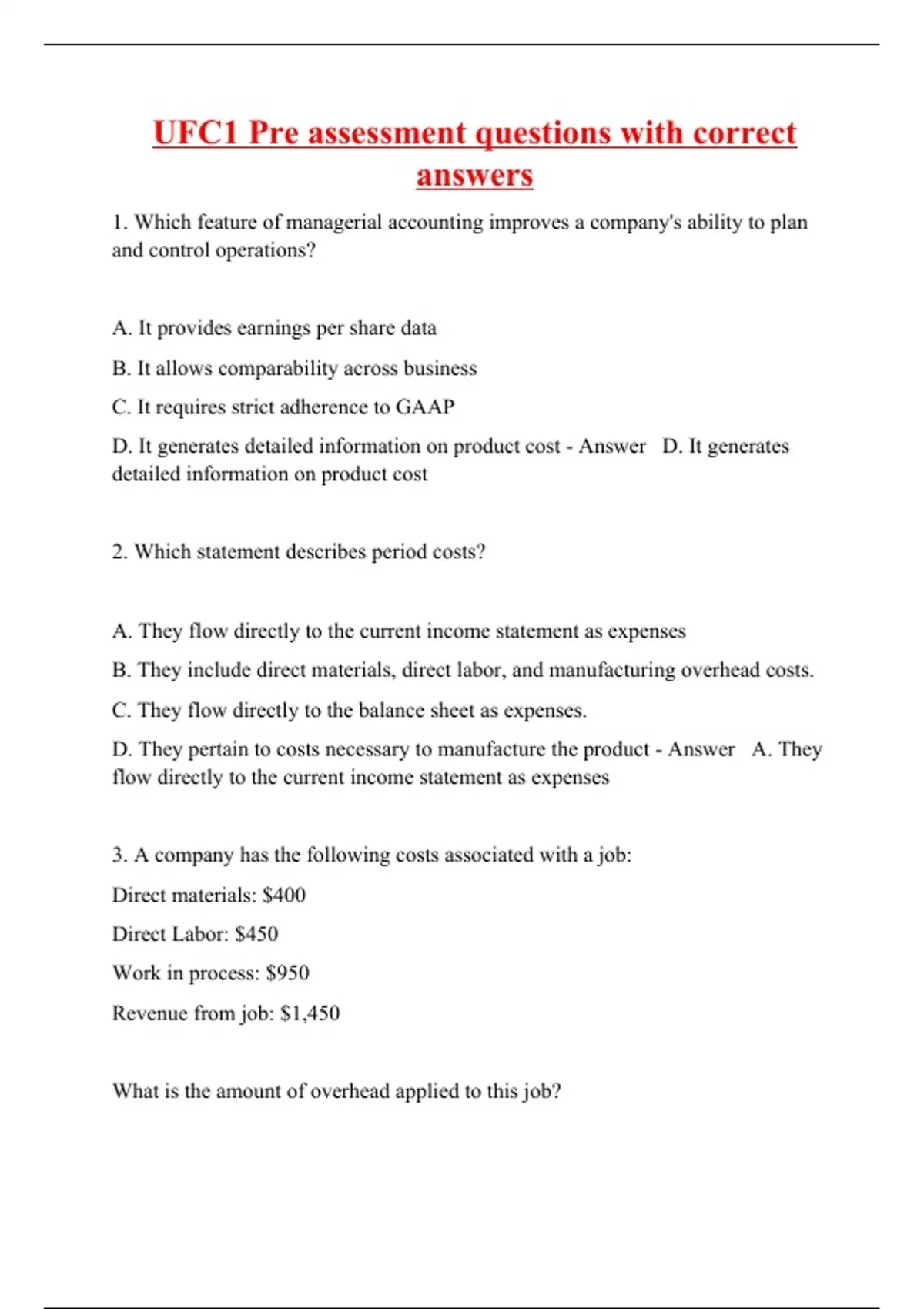 1. Which feature of managerial accounting improves a company's ability to plan and control operations? A. It provides earnings per share data B. It allows comparability across business C. It requires strict adherence to GAAP D. It generates detailed information on product cost - Answer D. It generates detailed information on product cost 2. Which statement describes period costs? A. They flow directly to the current income statement as expenses B. They include direct materials, direct labor, and manufacturing overhead costs. C. They flow directly to the balance sheet as expenses. D. They pertain to costs necessary to manufacture the product - Answer A. They flow directly to the current income statement as expenses 3. A company has the following costs associated with a job: Direct materials: $400 Direct Labor: $450 Work in process: $950