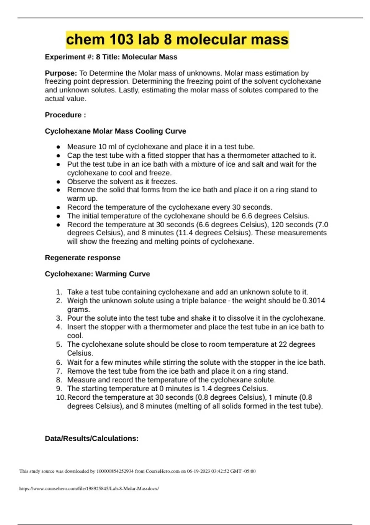 CHEM 103 Experiment 8 Molecular mass (Portage learning) 2023