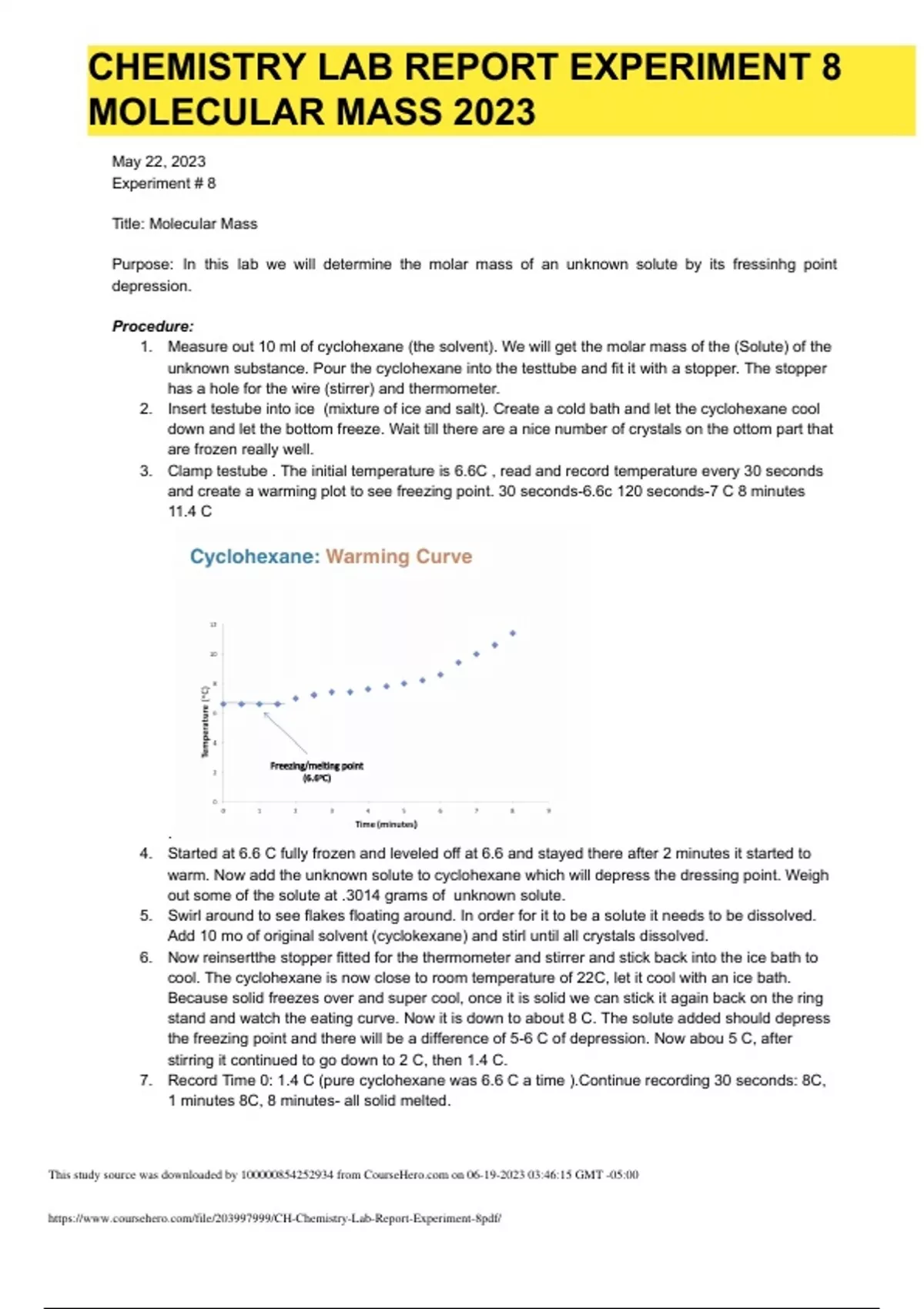CHEMISTRY (CHEM 103) LAB REPORT EXPERIMENT 8 MOLECULAR MASS 2023