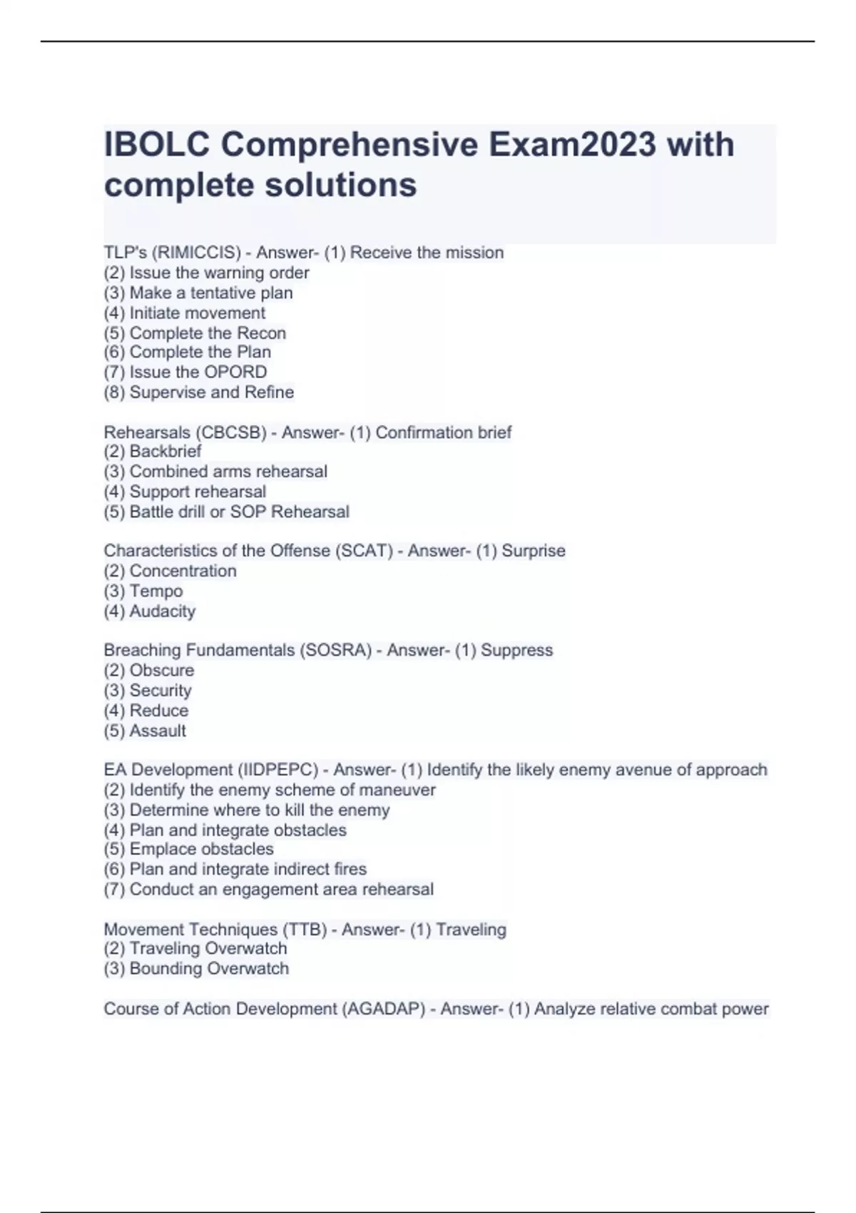 TLP's (RIMICCIS) - Answer- (1) Receive the mission (2) Issue the warning order (3) Make a tentative plan (4) Initiate movement (5) Complete the Recon (6) Complete the Plan (7) Issue the OPORD (8) Supervise and Refine Rehearsals (CBCSB) - Answer- (1) Confirmation brief (2) Backbrief (3) Combined arms rehearsal (4) Support rehearsal (5) Battle drill or SOP Rehearsal Characteristics of the Offense (SCAT) - Answer- (1) Surprise (2) Concentration (3) Tempo (4) Audacity Breaching Fundamentals (SOSRA) - Answer- (1) Suppress (2) Obscure (3) Security (4) Reduce (5) Assault EA Development (IIDPEPC) - Answer- (1) Identify the likely enemy avenue of approach (2) Identify the enemy scheme of maneuver (3) Determine where to kill the enemy (4) Plan and integrate obstacles (5) Emplace obstacles (6) Plan and integrate indirect fires (7) Conduct an engagement area rehearsal Movement Techniques (TTB) - Answer- (1) Traveling (2) Traveling Overwatch (3) Bounding Overwatch Course of Action Development (AGADAP) - Answer- (1) Analyze relative combat power (2) Generate Options (3) Array Forces (4) Develop concept of operations (5) Assign responsibilities (6) Prepare COA statement and sketch Organization Task to squads to conduct a breach (SBA) - Answer- (1) Support Force - Suppress, Obscure (SO) (2) Breach Force - Suppress, Obscure, Secure, Reduce (SOSR) (3) Assault Force - Assault, Suppress (A, maybe S) Who advises the platoon leader in all administrative, logistical and tactical matters? - Answer- Platoon Sergeant Identify the forms of maneuver based and draw the picture (PETIF). BE ABLE TO DRAW EACH ONE - Answer- (1) Penetration (2) Envelopment (3) Turning Movement (4) Infiltration (5) Frontal Attack Urban Operations Doctrine Source - Answer- FM 3-06 Elements of Multi-dimensional Urban Battlefield (ASSS) - Answer- (1) Airspace (2) Surface (3) Supersurface (4) Subsurface Four Major Urban Patterns (SNLS) BE ABLE TO DRAW EACH ONE - Answer- (1) Satellite (2) Network (3) Linear (4) Segment 4 Types of Battle Positions (PASS). BE ABLE TO DRAW EACH ONE - Answer- (1) Primary (2) Alternate (3) Supplementary (4) Subsequent Conditions of Urban Operations (SHP) - Answer- (1) Surgical (2) High intensity (3) Precision Fundamentals of Urban Operations (PACMSRPUC) - Answer- (1) Perform focused information & Aggressive Intelligence, Surveillance, & Reconnaissance (2) Conduct close combat (3) Avoid attrition approach (4) Control essentials (5) Minimize collateral damage (6) Separate combatants from non-combatants (7) Restore essential services (8) Understand human dimension (9) Control transition Types of Counseling (FM 6-22) - Answer- (1) Event Counseling (2) Performance Counseling (3) Progressive growth counseling MEDEVAC (FM 40-22) - Answer- Line 1 - Location of pick-up site Line 2 - Radio frequency, call sign, and suffix Line 3 - Number of patients by precedence Line 4 - Special equipment required Line 5 - Number of patients Line 6 - Security at pick-up site Line 7 - Method of marking pick-up site Line 8 - Patient nationality and status Line 9 - NBC *In peacetime use terrain Offense and Defense (ADRP 3-90) (ARM) - Answer- (1) Area Defense (2) Retrograde (3) Mobile Defense Retrograde Forms usually involve combination of... (DRW) - Answer- (1) Delay (2) Retirement (3) Withdrawal 3 Forms of Defense (LRP) - Answer- (1) Defense of linear obstacle (2) Reverse Slope (3) Perimeter Call for Fire Format (OWTTMM) - Answer- (1) Observer ID (2) Warning Order - Adjust fire/fire for effect/suppression/ immediate suppression or smoke (3) Target Location - Grid coordinates/shift from known point/polar plot coordinates (4) Target Description (5) Method of engagement type of adjustment/ammunition & fuse/distribution (6) Method of fire and control - method of fire/method of control (fire when ready or at my command) Dispersion Area - Answer- The area within the SDZ location between the GTL, and the Ricoh her area. This area accounts for human error, gun or cannon tube wear, propellant temperature, and so forth Ricochet Area - Answer- The area located to the left and right of the dispersion area that contains projectiles after making initial contact with the target medium. For SDZ's having Angles P and Q, it is also the area located to the left and right of the dispersion area. The ricochet area is defined by distance W. Area A - Answer- The secondary danger area (buffer zone) that laterally parallels the impact area or ricochet area (depending on the weapon system) and contains fragments, debris, and components from frangible or explosive projectiles and warheads functioning on the right or left edge of the impact area or ricochet area. 5 Types of Command and Supply Discipline Responsibilities (AR 735-5) - Answer- Command Supervisory Direct Custodial Personal Reconnaissance Fundamentals (DODGERR) - Answer- (1) Do not keep recon assets in reserve (2) Orient on the recon objective (3) Develop the situation rapidly (4) Gain and maintain enemy contact (5) Ensure continuous recon (6) Report information rapidly and accurately (7) Retain freedom of maneuver Rates of fire for M249 MG - Answer- Sustained - 100 rds/min Rapid - 200 rds/min Cyclic - 650 to 850 rds/min M249 Range - Answer- Bipod/point - 600m Bipod/area - 800m Tripod/area - 1,000m Grazing - 600m Max Range - 3600m M240B - Answer- Bipod/point - 600m Tripod/point - 800m Bipod/area - 1,100m Suppression - 1,800m Grazing - 600m Max Range - 3725m Five Principles of Patrolling (PRSCC) - Answer- (1) Planning (2) Recon (3) Security (4) Control (5) Common Sense Phases or stages of irregular warfare /insurgency - Answer- (1) Strategic defensive (2) Strategic stalemate (3) Strategic counteroffensive Steps of the Intelligence Preparation of the Battlefield/Battlespace (IPB) and Reconnaissance Fundamentals (FM 34-130) - Answer- (1) Determine battlefield environment (2) Describe battlefield effects (3) Evaluate the threat (4) Determine threat COAs