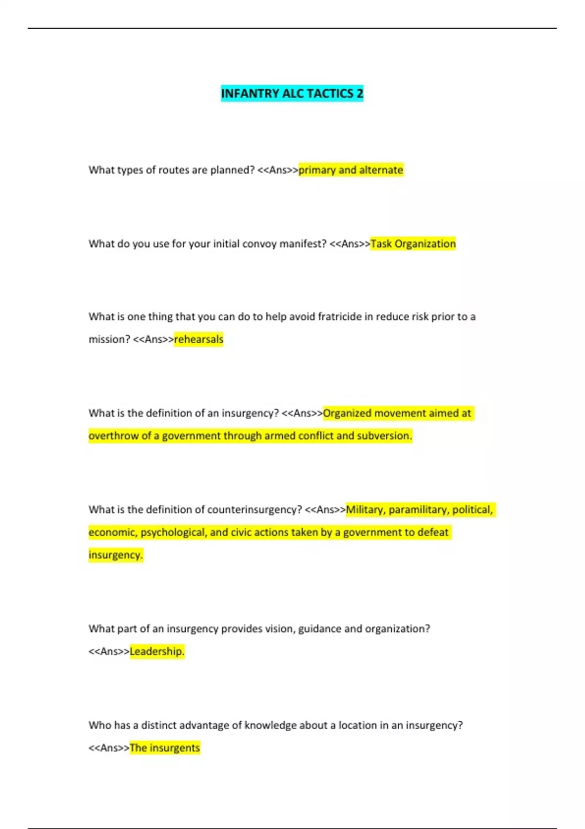 What types of routes are planned? <<Ans>>primary and alternate What do you use for your initial convoy manifest? <<Ans>>Task Organization What is one thing that you can do to help avoid fratricide in reduce risk prior to a mission? <<Ans>>rehearsals What is the definition of an insurgency? <<Ans>>Organized movement aimed at overthrow of a government through armed conflict and subversion. What is the definition of counterinsurgency? <<Ans>>Military, paramilitary, political, economic, psychological, and civic actions taken by a government to defeat insurgency. What part of an insurgency provides vision, guidance and organization? <<Ans>>Leadership. Who has a distinct advantage of knowledge about a location in an insurgency? <<Ans>>The insurge