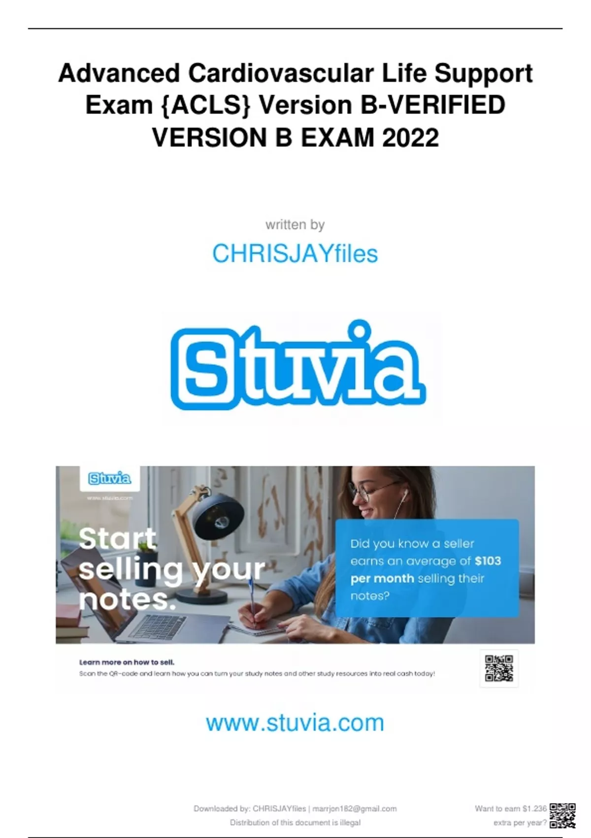 Advanced Cardiovascular Life Support Exam {ACLS} Version B-VERIFIED VERSION B EXAM 2022 written by CHRISJAYfiles Downloaded by: CHRISJAYfiles | Distribution of this document is illegal Want to earn $1.236 extra per year? Advanced Cardiovascular Life Support Exam Version B (50 questions) Please do not mark on this exam. Record the best answer on the separate answer sheet. 1. What should be done to minimize interruptions in chest compressions during CPR? A. Perform pulse checks only after defibrillation. B. Continue CPR while the defibrillator is charging. C. Administer IV medications only when breaths are given. D. Continue to use AED even after the arrival of a manual defibrillator. 2. Which condition is an indication to stop or withhold resuscitative efforts? A. Unwitnessed arrest B. Safety threat to providers C. Patient age greater than 85 years D. No return of spontaneous circulation after 10 minutes of CPR 3. After verifying the absence of a pulse, you initiate CPR with adequate bag-mask ventilation. The patient’s lead II ECG appears below. What is your next action? A. IV or IO access B. Endotracheal tube placement C. Consultation with cardiology for possible PCI D. Application of a transcutaneous pacemaker 4. After verifying unresponsiveness and abnormal breathing, you activate the emergency response team. What is your next action? A. Retrieve an AED. B. Check for a pulse. C. Deliver 2 rescue breaths. D. Administer a precordial thump. S - The Marketplace to Buy and Sell your Study Material Downloaded by: CHRISJAYfiles | Distribution of this document is illegal Want to earn $1.236 extra per year? S - The Marketplace to Buy and Sell your Study Material 5. What is the recommendation on the use of cricoid pressure to prevent aspiration during cardiac arrest? A. Not recommended for routine use B. Recommended during every resuscitation attempt C. Recommended when the patient is vomiting D. Recommended only for supraglottic airway insertion 6. What survival advantages does CPR provide to a patient in ventricular fibrillation? A. Increases the defibrillation threshold B. Directly restores an organized rhythm C. Opposes the harmful effects of epinephrine D. Produces a small amount of blood flow to the heart 7. What is the recommended compression rate for performing CPR? A. 60 to 80 per minute B. 80 to 100 per minute C. About 100 per minute D. At least 100 per minute 8. EMS personnel arrive to find a patient in cardiac arrest. Bystanders are performing CPR. After attaching a cardiac monitor, the responder observes the following rhythm strip. What is the most important early intervention? A. Defibrillation B. Endotracheal intubation C. Epinephrine administration D. Antiarrhythmic administration 9. A patient remains in ventricular fibrillation despite 1 shock and 2 minutes of continuous CPR. The next intervention is to A. administer amiodarone. B. administer a second shock. C. administer epinephrine. D. insert an advanced airway. Downloaded by: CHRISJAYfiles | Distribution of this document is illegal Want to earn $1.236 extra per year? S - The Marketplace to Buy and Sell your Study Material 10. What is the recommended next step after a defibrillation attempt? A. Open the patient’s airway. B. Determine if a carotid pulse is present. C. Check the ECG for evidence of a rhythm. D. Begin CPR, starting with chest compressions. 11. Which of the following is the recommended first choice for establishing intravenous access during the attempted resuscitation of a patient in cardiac arrest? A. Subclavian vein B. Antecubital vein C. Intraosseous line D. Internal jugular vein 12. What is the recommended first intravenous dose of amiodarone for a patient with refractory ventricular fibrillation? A. 1 mg B. 1 mg/kg C. 1 mEq/kg D. 300 mg 13. IV/IO drug administration during CPR should be A. given rapidly during compressions. B. administered slowly during the pause for a pulse check. C. given by infusion. D. given before any defibrillation attempts. 14. How often should the team leader switch chest compressors during a resuscitation attempt? A. Every minute B. Every 2 minutes C. Every 3 minutes D. Every 4 minutes 15. Which finding is a sign of ineffective CPR? A. PETCO2 <10 mm Hg B. Patient temperature >32°C (89.6°F) C. Diastolic intra-arterial pressure ≥20 mm Hg D. Measured patient urine output of 1 mL/kg per hour Downloaded by: CHRISJAYfiles | Distribution of this document is illegal Want to earn $1.236 extra per year? S - The Marketplace to Buy and Sell your Study Material Downloaded by: CHRISJAYfiles | Distribution of this document is illegal Want to earn $1.236 extra per year? S - The Marketplace to Buy and Sell your Study Material Downloaded by: CHRISJAYfiles | Distribution of this document is illegal Want to earn $1.236 extra per year? S - The Marketplace to Buy and Sell your Study Material 16. A team leader orders 1 mg of epinephrine, and a team member verbally acknowledges when the medication is administered. What element of effective resuscitation team dynamics does this represent? A. Clear messages B. Knowing one’s limitations C. Closed-loop communication D. Clear roles and responsibilities 17. How long should it take to perform a pulse check during the BLS Survey? A. 1 to 5 seconds B. 5 to 10 seconds C. 10 to 15 seconds D. 15 to 20 seconds 18. Your rescue team arrives to find a 59-year-old man lying on the kitchen floor. You determine that he is unresponsive and notice that he is taking agonal breaths. What is the next step in your assessment and management of this patient? A. Apply the AED. B. Check the patient’s pulse. C. Open the patient’s airway. D. Check for the presence of breathing. 19. Which treatment or medication is appropriate for the treatment of a patient in asystole? A. Atropine B. Epinephrine C. Defibrillation D. Transcutaneous pacing 20. An AED advises a shock for a pulseless patient lying in snow. What is the next action? A. Place a backboard beneath the patient and ad