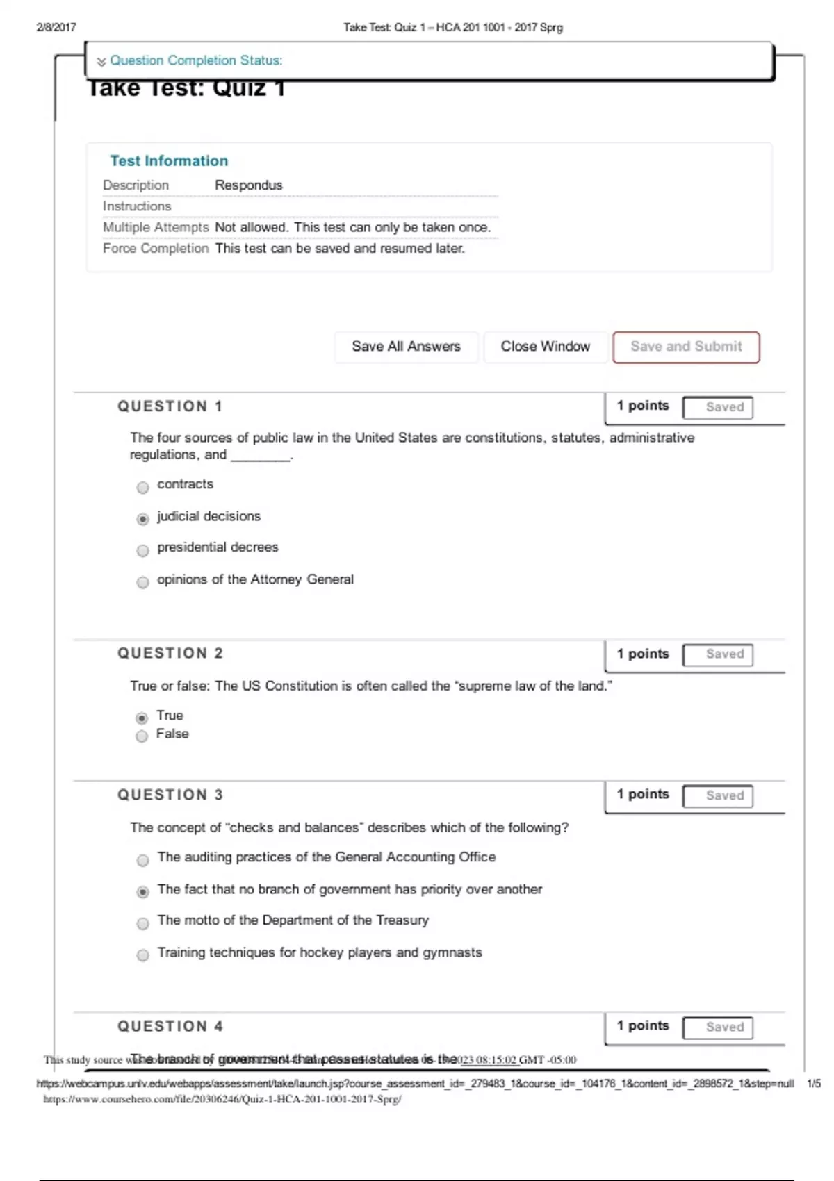 The four sources of public law in the United States are constitutions, statutes, administrative regulations, and ________. contracts judicial decisions presidential decrees opinions of the Attorney General QUESTION 1 1 points Saved True or false: The US Constitution is often called the “supreme law of the land.” True False QUESTION 2 1 points Saved The concept of “checks and balances” describes which of the following? The auditing practices of the General Accounting Office The fact that no branch of government has priority over another The motto of the Department of the Treasury Training techniques for hockey players and gymnasts