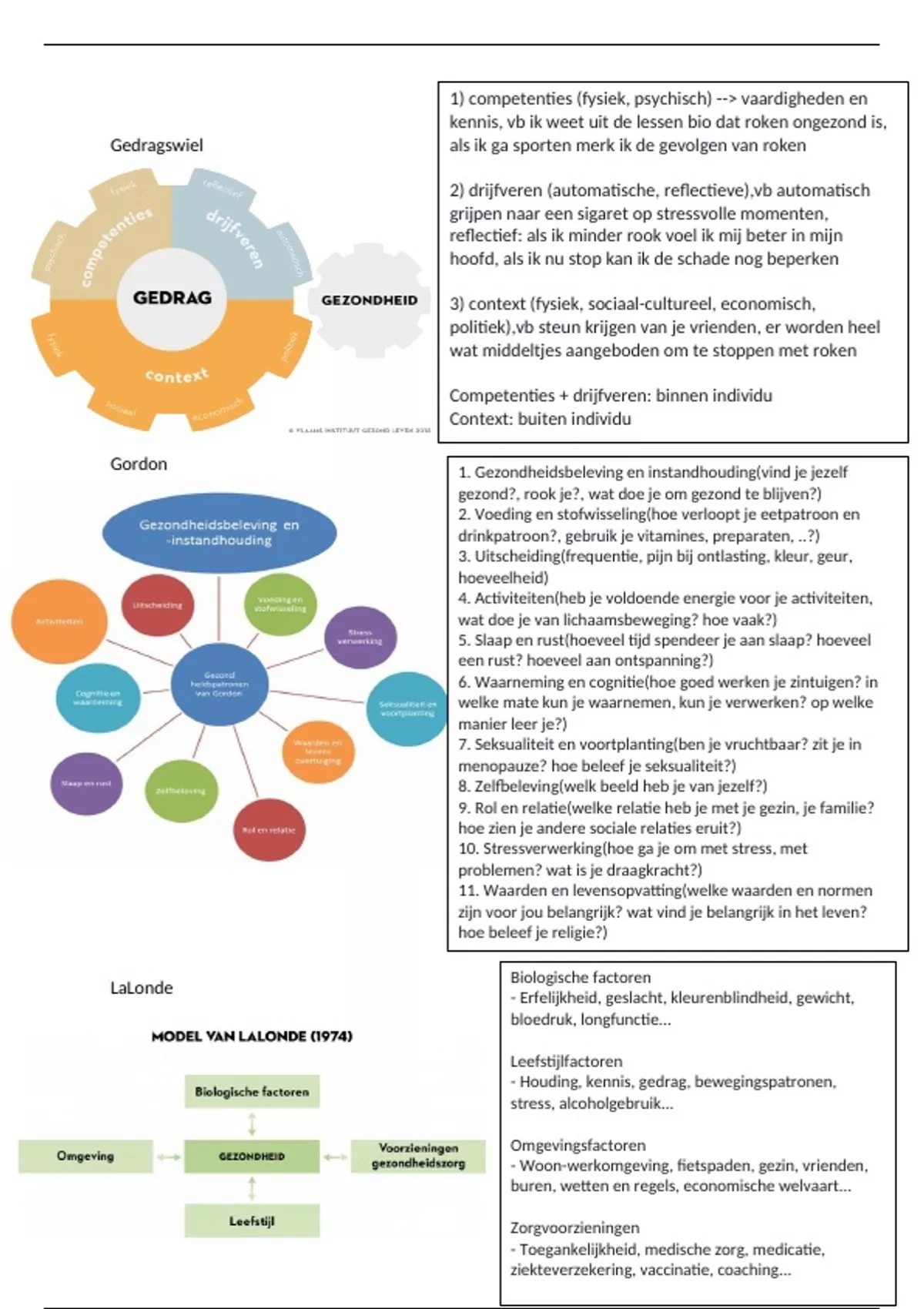 Al de modellen samengevat voor het vak gezondheidszorg (healthy lifestyle en sociale wetenschappen). Foto van het model + uitleg. Gedragswiel, LaLonde, ICF, Gorden, model van gepland gedrah, COM-B model, behaivior change wheel, gedragslenzenmodel, ...