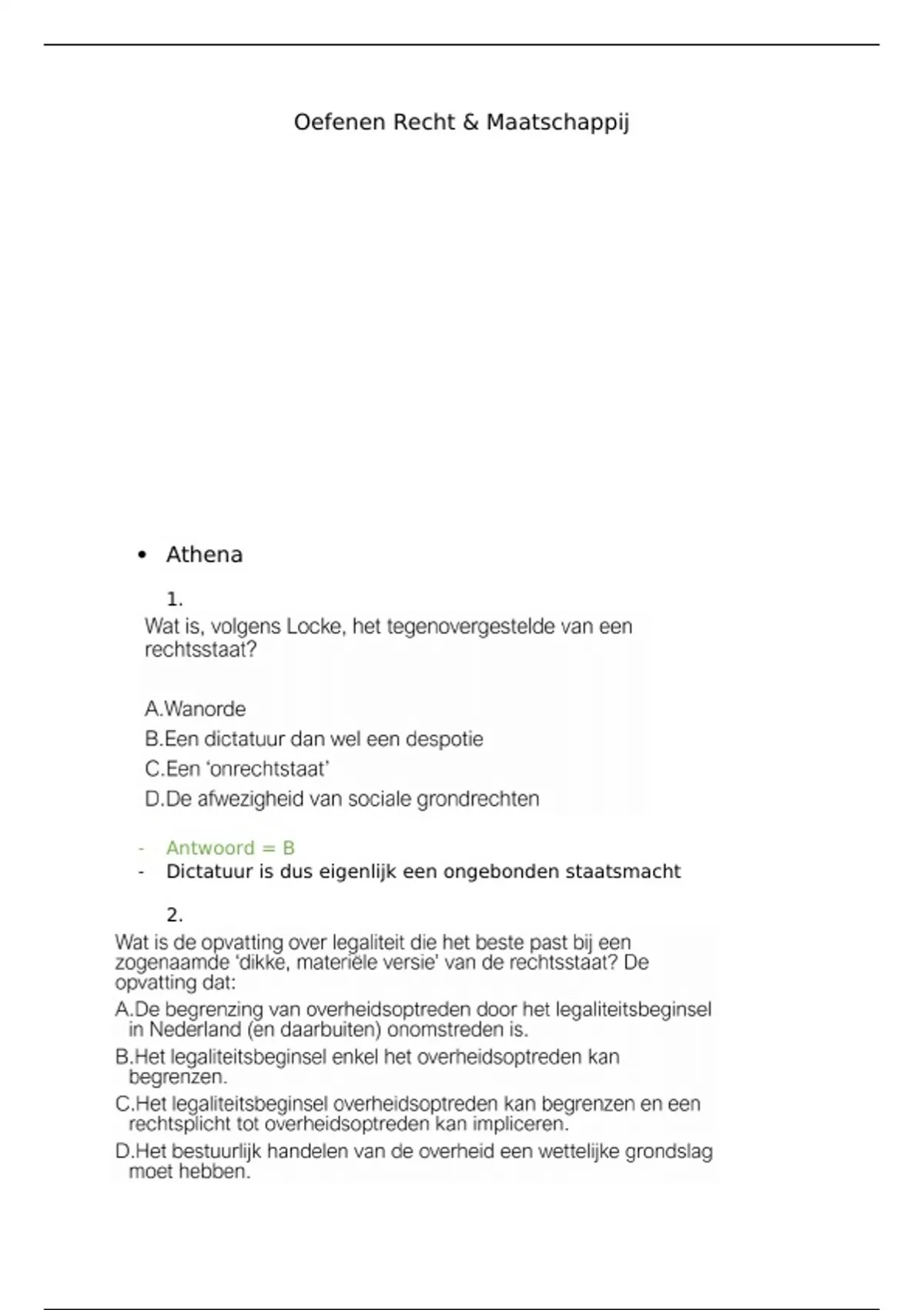 Dit document bevat een aantal oefenvragen, die bestaan uit oud-tentamenvragen (MC-vragen), met daarbij de antwoorden voor het vak Recht en Maatschappij. Aangezien het tentamen voornamelijk bestaat uit MC-vragen, is dit een goede oefening voor het tentamen. Ik heb een 8,5 behaald voor het tentamen.