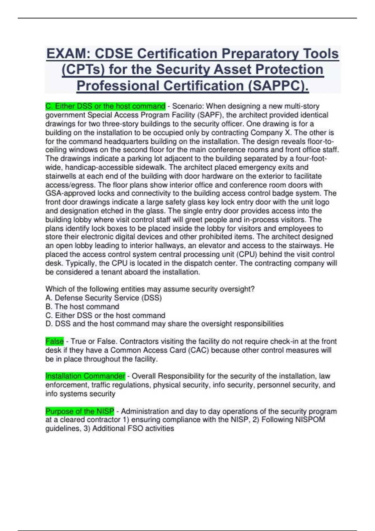 EXAM: CDSE Certification Preparatory Tools (CPTs) for the Security Asset Protection Professional Certification (SAPPC).
