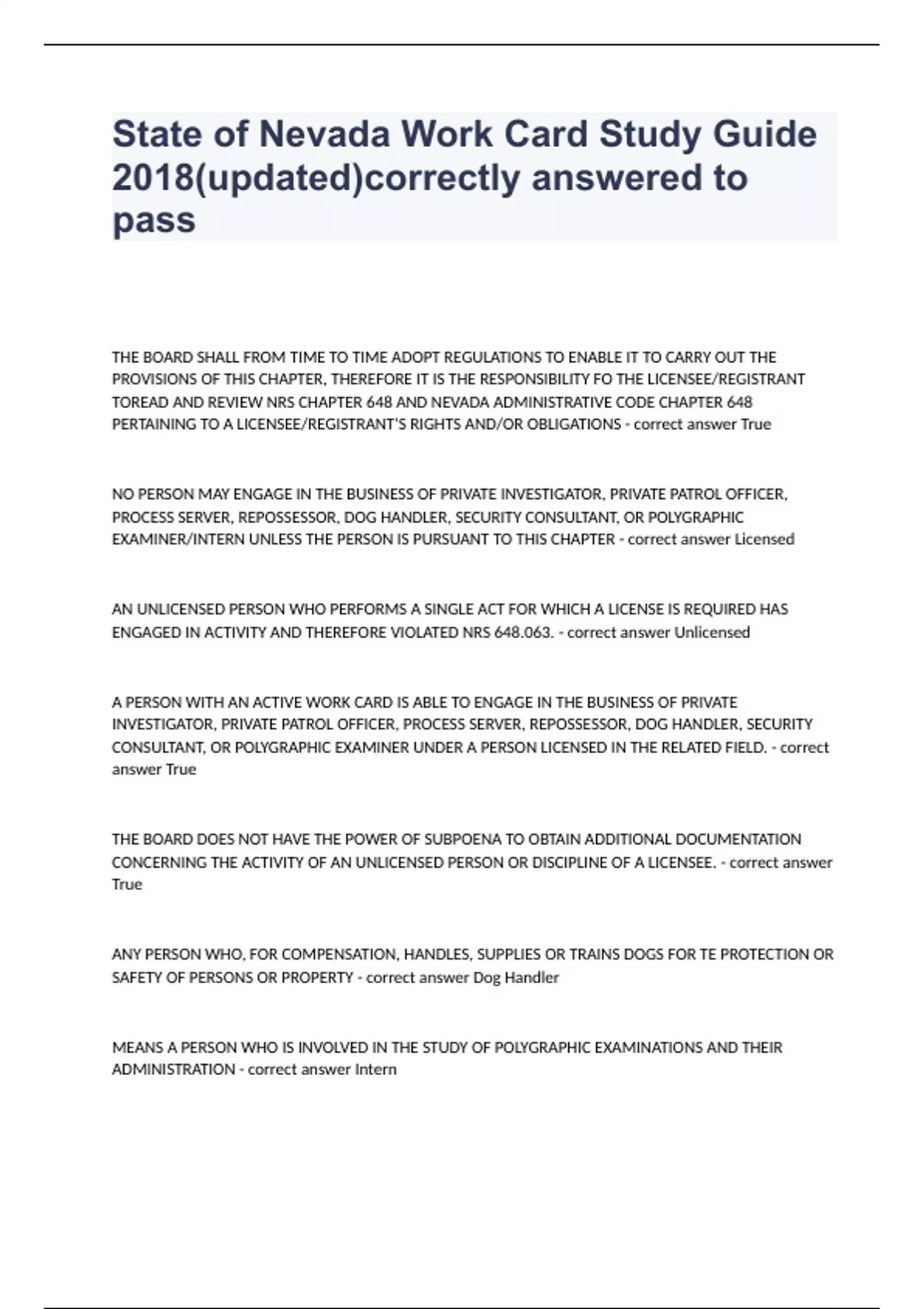 State of Nevada Work Card Study Guide 2018(updated)correctly answered to passTHE BOARD SHALL FROM TIME TO TIME ADOPT REGULATIONS TO ENABLE IT TO CARRY OUT THE PROVISIONS OF THIS CHAPTER, THEREFORE IT IS THE RESPONSIBILITY FO THE LICENSEE/REGISTRANT TOREAD AND REVIEW NRS CHAPTER 648 AND NEVADA ADMINISTRATIVE CODE CHAPTER 648 PERTAINING TO A LICENSEE/REGISTRANT'S RIGHTS AND/OR OBLIGATIONS - correct answer True NO PERSON MAY ENGAGE IN THE BUSINESS OF PRIVATE INVESTIGATOR, PRIVATE PATROL OFFICER, PROCESS SERVER, REPOSSESSOR, DOG HANDLER, SECURITY CONSULTANT, OR POLYGRAPHIC EXAMINER/INTERN UNLESS THE PERSON IS PURSUANT TO THIS CHAPTER - correct answer Licensed AN UNLICENSED PERSON WHO PERFORMS A SINGLE ACT FOR WHICH A LICENSE IS REQUIRED HAS ENGAGED IN ACTIVITY AND THEREFORE VIOLATED NRS 648.063. - correct answer Unlicensed A PERSON WITH AN ACTIVE WORK CARD IS ABLE TO ENGAGE IN THE BUSINESS OF PRIVATE INVESTIGATOR, PRIVATE PATROL OFFICER, PROCESS SERVER, REPOSSESSOR, DOG HANDLER, SECURITY CONSULTANT, OR POLYGRAPHIC EXAMINER UNDER A PERSON LICENSED IN THE RELATED FIELD. - correct answer True THE BOARD DOES NOT HAVE THE POWER OF SUBPOENA TO OBTAIN ADDITIONAL DOCUMENTATION CONCERNING THE ACTIVITY OF AN UNLICENSED PERSON OR DISCIPLINE OF A LICENSEE. - correct answer True ANY PERSON WHO, FOR COMPENSATION, HANDLES, SUPPLIES OR TRAINS DOGS FOR TE PROTECTION OR SAFETY OF PERSONS OR PROPERTY - correct answer Dog Handler MEANS A PERSON WHO IS INVOLVED IN THE STUDY OF POLYGRAPHIC EXAMINATIONS AND THEIR ADMINISTRATION - correct answer Intern MEANS ANY PERSON WHO HOLD A LICENSE OR CERTIFICATE ISSUED PURSUANT TO THE PROVISIONS OF THIS CHAPTER - correct answer Licensee MEANS AN INSTRUMENT OR ELECTRONIC OR MECHANICAL DEVICE WHICH RECORDS OR MEASURES PHYSIOLOGICAL EFFECTS OF PSYCHOLOGICAL STIMULI TO PERMIT THE EXAMINER OR INTERN TO FORM AN OPINION CONCERNING THE VERACITY OF STATEMENTS MADE BY THE PERSON EXAMINED - correct answer Polygraph MEANS THE PROCEDURE BY WHICH AN EXAMINER OR INTERN RENDERS HIS OR HER EXPERT OPINION AS TO THE VERACITY OF STATEMENTS MADE BY THE PERSON EXAMINED - correct answer Polygraphic examination MEANS A PERSON WHO BY VIRTUE OF HIS OR HER EDUCATION, TRAINING AN EXPERIENCE, IS CAPABLE OF CONDUCTING A VALID AND RELIABLE POLYGRAPHIC EXAMINATION - correct answer Polygraphic examiner MEANS ANY PERSON WHO FOR ANY CONSIDERATION ENGAGES IN BUSINESS OR ACCEPTS EMPLOYMENT TO FURNISH, OR AGREES TO MAKE OR MAKES ANY INVESTIGATION FOR THE PURPOSE OF OBTAINING, INFORMATION WITH REFERENCE TO... ETC - correct answer Private investigator MEANS A PERSON ENGAGED IN THE BUSINESS OF EMPLOYING AND PROVIDING FOR OTHER PERSONS WATCHMEN, ETC, FOR THE PURPOSE OF PROTECTING PERSONS OR PROPERTY - correct answer Private patrol officer MEANS A PERSON, OTHER THAN A PEACE OFFICER OF THE STATE FO NEVADA, WHO ENGAGES IN THE BUSINESS OF SERVING LEGAL PROCESS WITHIN THIS STATE - correct answer Process server MEANS A PERSON WHO ENGAGES IN BUSINESS OR ACCEPTS EMPLOYMENT TO LOCATE OR RECOVER PERSONAL PROPERTY WHICH HAS BEEN SOLD UNDER A CONDITIONAL SALES AGREEMENT OR WHICH IS SUBJECT TO ANHY OTHER SECURITY INTEREST - correct answer Repossessor MEANS A PERSON LICENSED AS A PRIVATE PATROL OFFICER OR PRIVATE INVESTIGATOR WHO ENGAGES IN THE BUSINESS OF FURNISHING ADVICE ON THE PROPER METHODS AND EQUIPMENT FOR PROVIDING SECURITY AND PROTECTION FOR PERSONS AND PROPERTY - correct answer Security consultant