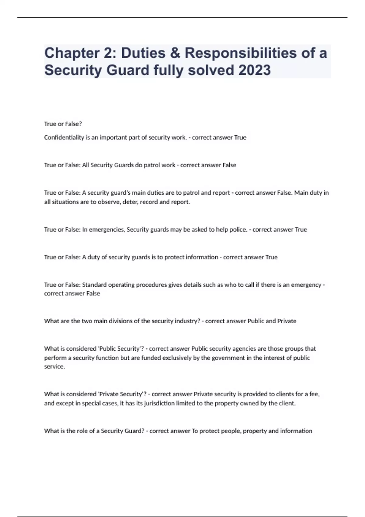 Chapter 2: Duties & Responsibilities of a Security Guard fully solved 2023True or False? Confidentiality is an important part of security work. - correct answer True True or False: All Security Guards do patrol work - correct answer False True or False: A security guard's main duties are to patrol and report - correct answer False. Main duty in all situations are to observe, deter, record and report. True or False: In emergencies, Security guards may be asked to help police. - correct answer True True or False: A duty of security guards is to protect information - correct answer True True or False: Standard operating procedures gives details such as who to call if there is an emergency - correct answer False What are the two main divisions of the security industry? - correct answer Public and Private What is considered 'Public Security'? - correct answer Public security agencies are those groups that perform a security function but are funded exclusively by the government in the interest of public service. What is considered 'Private Security'? - correct answer Private security is provided to clients for a fee, and except in special cases, it has its jurisdiction limited to the property owned by the client. What is the role of a Security Guard? - correct answer To protect people, property and information