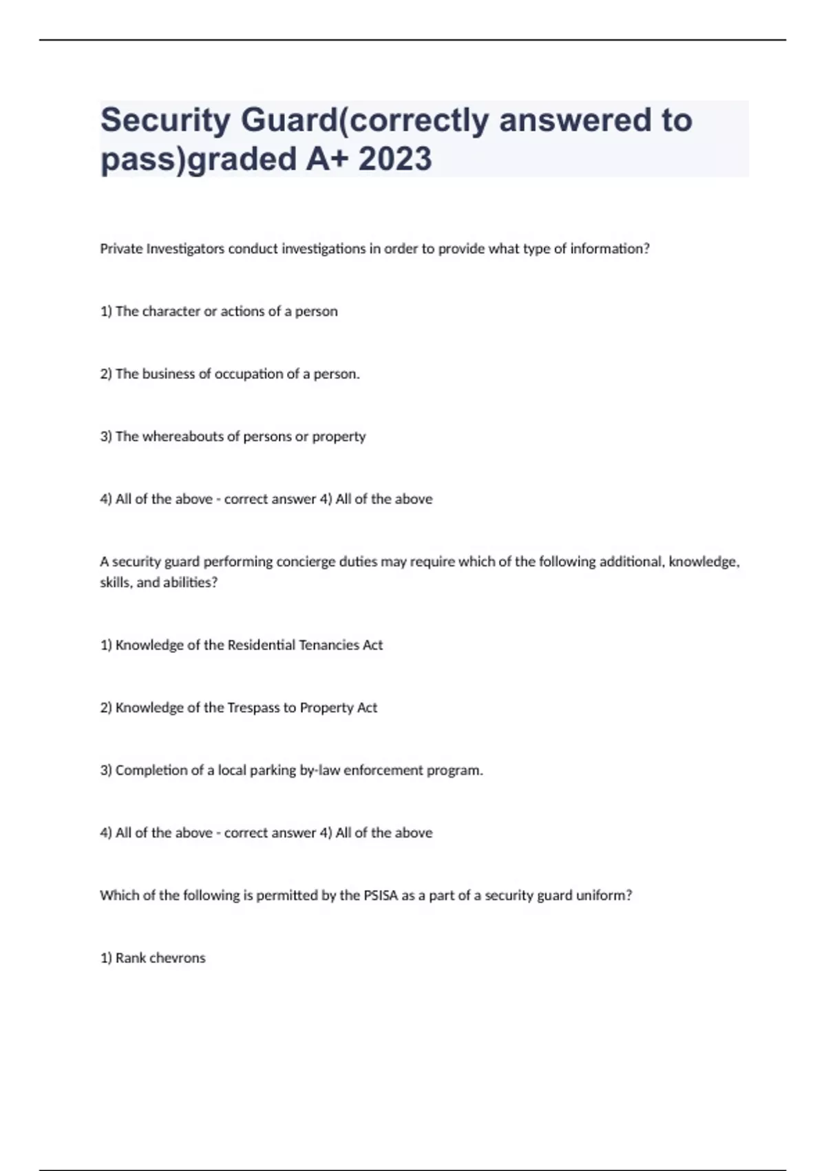 Security Guard(correctly answered to pass)graded A+ 2023 Private Investigators conduct investigations in order to provide what type of information? 1) The character or actions of a person 2) The business of occupation of a person. 3) The whereabouts of persons or property 4) All of the above - correct answer 4) All of the above A security guard performing concierge duties may require which of the following additional, knowledge, skills, and abilities? 1) Knowledge of the Residential Tenancies Act 2) Knowledge of the Trespass to Property Act 3) Completion of a local parking by-law enforcement program. 4) All of the above - correct answer 4) All of the above Which of the following is permitted by the PSISA as a part of a security guard uniform? 1) Rank chevrons 2) Black collared uniform shirts 3) Black uniform pants with a reflective safety stripe down the side 4) Jacket without the word "Security" permanently affixed to it. - correct answer 3) Black uniform pants with a reflective safety stripe down the side Under the legislation governing security services in Ontario, in-house security are not required to be licensed. 1) True 2) False - correct answer 2) False Which one of the following is not a physical sign of substance abuse? 1) Slowed or staggered walk and poor physical coordination. 2) Nausea, vomiting or excessive sweating. 3) Paranoia. 4) Tremors or shakes of hands, feet or head - correct answer 3) Paranoia. Which of the following statements are true regarding WHMIS training? 1) Only generic WHMIS education is required for all work places. 2) Every employee requires a WHMIS certification.