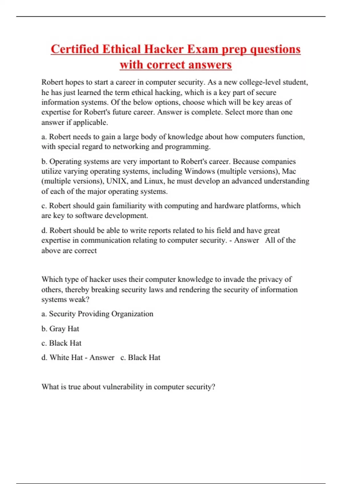 Robert hopes to start a career in computer security. As a new college-level student, he has just learned the term ethical hacking, which is a key part of secure information systems. Of the below options, choose which will be key areas of expertise for Robert's future career. Answer is complete. Select more than one answer if applicable. a. Robert needs to gain a large body of knowledge about how computers function, with special regard to networking and programming. b. Operating systems are very important to Robert's career. Because companies utilize varying operating systems, including Windows (multiple versions), Mac (multiple versions), UNIX, and Linux, he must develop an advanced understanding of each of the major operating systems. c. Robert should gain familiarity with computing and hardware platforms, which are key to software development. d. Robert should be able to write reports related to his field and have great expertise in communication relating to computer security. - Answer All of the above are correct Which type of hacker uses their computer knowledge to invade the privacy of others, thereby breaking security laws and rendering the security of information systems weak? a. Security Providing Organization b. Gray Hat c. Black Hat d. White Hat - Answer c. Black Hat