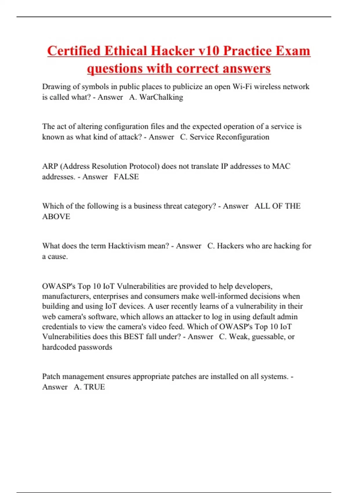 Drawing of symbols in public places to publicize an open Wi-Fi wireless network is called what? - Answer A. WarChalking The act of altering configuration files and the expected operation of a service is known as what kind of attack? - Answer C. Service Reconfiguration ARP (Address Resolution Protocol) does not translate IP addresses to MAC addresses. - Answer FALSE Which of the following is a business threat category? - Answer ALL OF THE ABOVE What does the term Hacktivism mean? - Answer C. Hackers who are hacking for a cause. OWASP's Top 10 IoT Vulnerabilities are provided to help developers, manufacturers, enterprises and consumers make well-informed decisions when building and using IoT devices. A user recently learns of a vulnerability in their web camera's software, which allows an attacker to log in using default admin credentials to view the camera's video feed. Which of OWASP's Top 10 IoT Vulnerabilities does this BEST fall under? - Answer C. Weak, guessable, or hardcoded passwords Patch management ensures appropriate patches are installed on all systems. - Answer A. TRUE