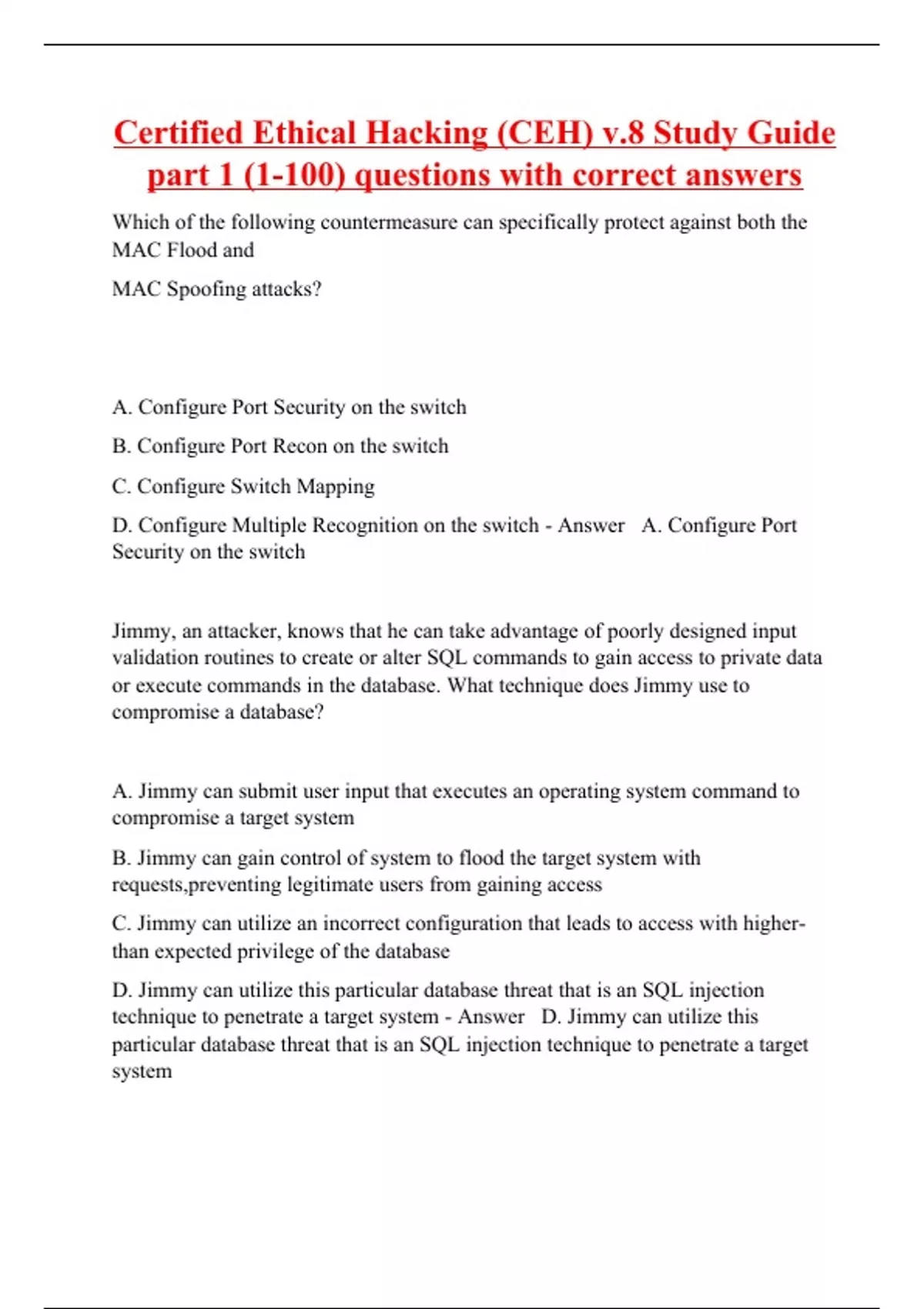 Which of the following countermeasure can specifically protect against both the MAC Flood and MAC Spoofing attacks? A. Configure Port Security on the switch B. Configure Port Recon on the switch C. Configure Switch Mapping D. Configure Multiple Recognition on the switch - Answer A. Configure Port Security on the switch Jimmy, an attacker, knows that he can take advantage of poorly designed input validation routines to create or alter SQL commands to gain access to private data or execute commands in the database. What technique does Jimmy use to compromise a database? A. Jimmy can submit user input that executes an operating system command to compromise a target system B. Jimmy can gain control of system to flood the target system with requests,preventing legitimate users from gaining access C. Jimmy can utilize an incorrect configuration that leads to access with higher-than expected privilege of the database D. Jimmy can utilize this particular database threat that is an SQL injection technique to penetrate a target system - Answer D. Jimmy can utilize this particular database threat that is an SQL injection technique to penetrate a target system