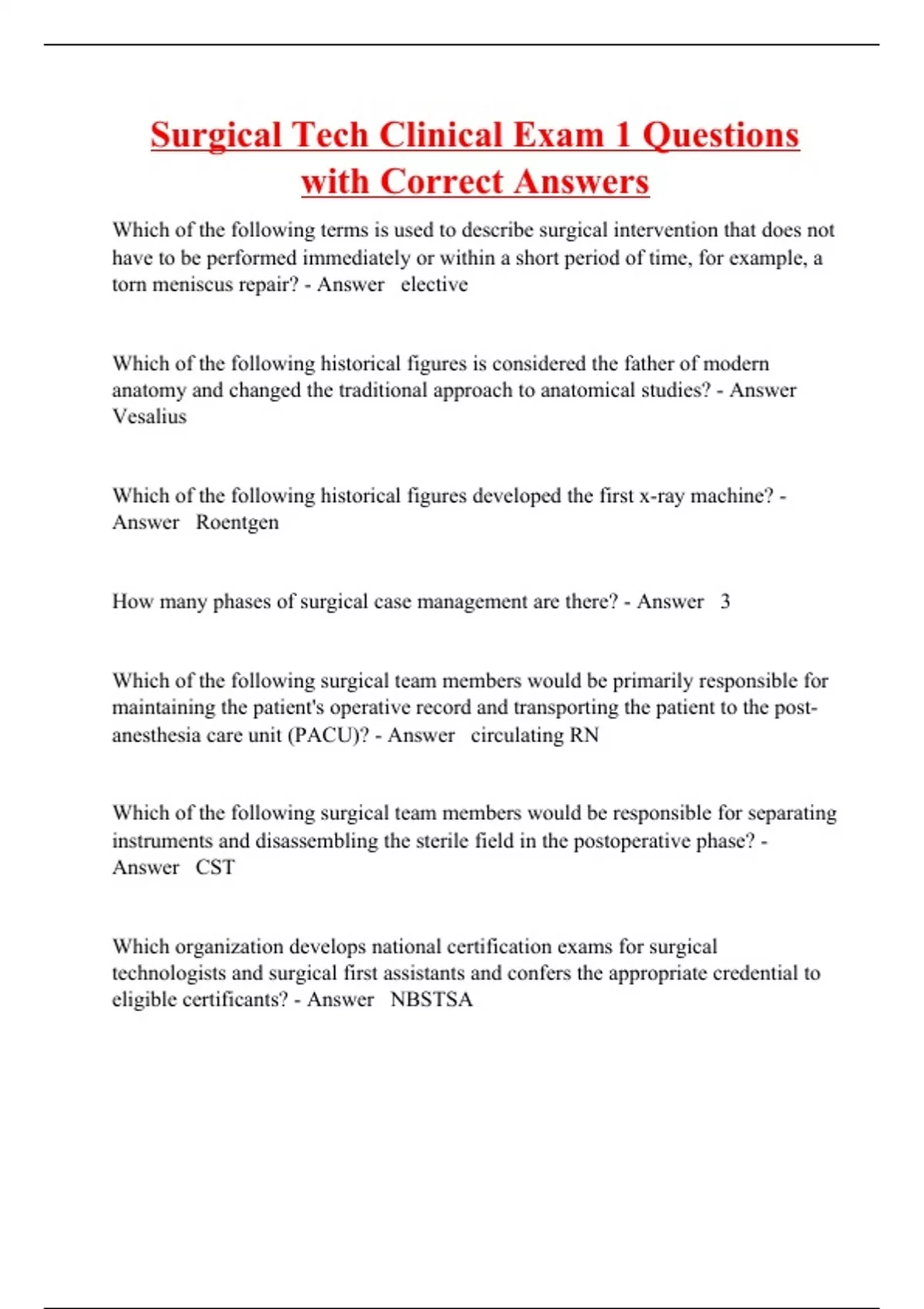 Which of the following terms is used to describe surgical intervention that does not have to be performed immediately or within a short period of time, for example, a torn meniscus repair? - Answer elective Which of the following historical figures is considered the father of modern anatomy and changed the traditional approach to anatomical studies? - Answer Vesalius Which of the following historical figures developed the first x-ray machine? - Answer Roentgen How many phases of surgical case management are there? - Answer 3 Which of the following surgical team members would be primarily responsible for maintaining the patient's operative record and transporting the patient to the post-anesthesia care unit (PACU)? - Answer circulating RN Which of the following surgical team members would be responsible for separating instruments and disassembling the sterile field in the postoperative phase? - Answer CST