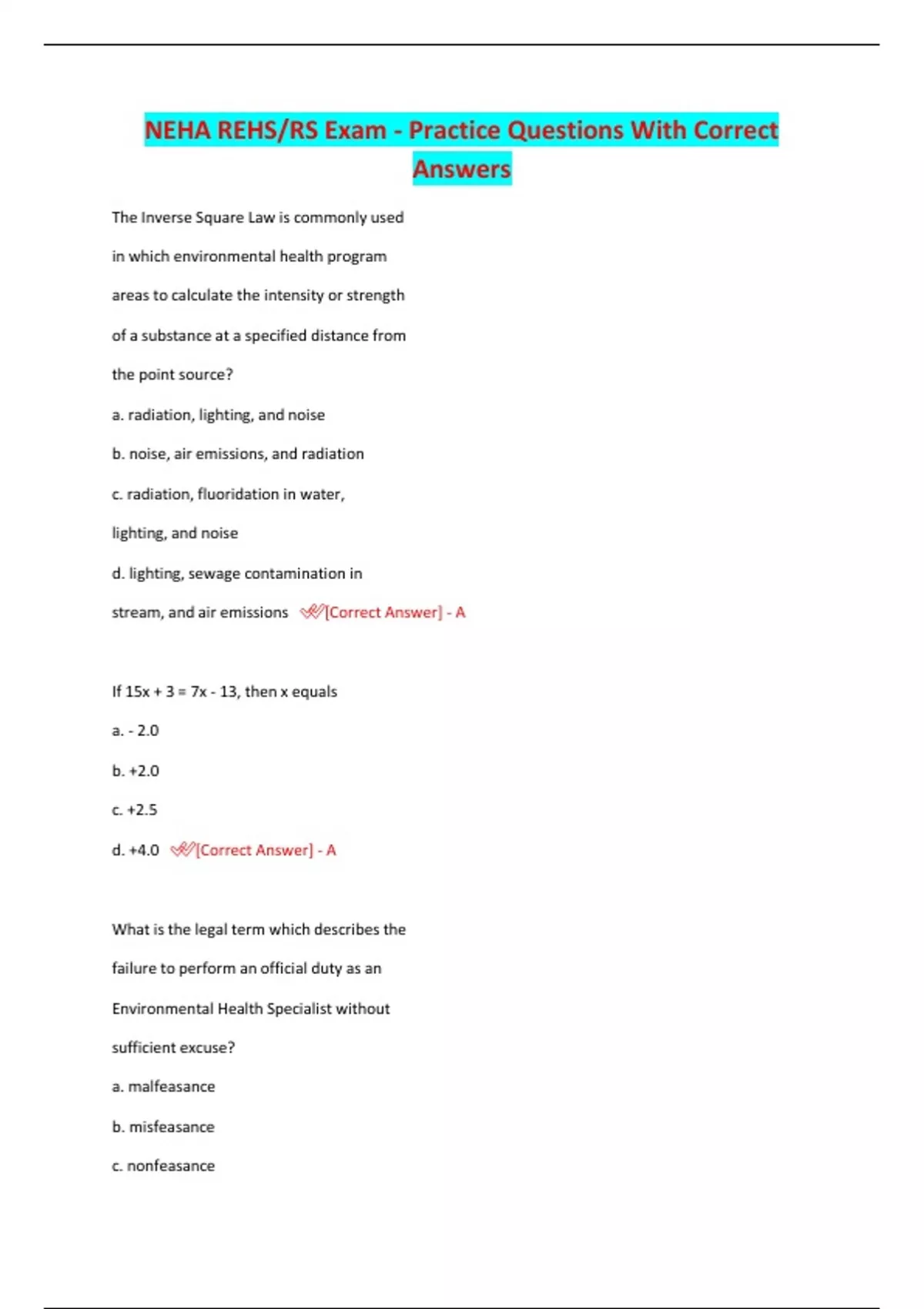 NEHA REHS/RS Exam - Practice Questions With Correct Answers The Inverse Square Law is commonly used in which environmental health program areas to calculate the intensity or strength of a substance at a specified distance from the point source? a. radiation, lighting, and noise b. noise, air emissions, and radiation c. radiation, fluoridation in water, lighting, and noise d. lighting, sewage contamination in stream, and air emissions [Correct Answer] - A If 15x + 3 = 7x - 13, then x equals a. - 2.0 b. +2.0 c. +2.5 d. +4.0 [Correct Answer] - A What is the legal term which describes the failure to perform an official duty as an Environmental Health Specialist without sufficient excuse? a. malfeasance b. misfeasance c. nonfeasance d. criminal responsibility [Correct Answer] - C