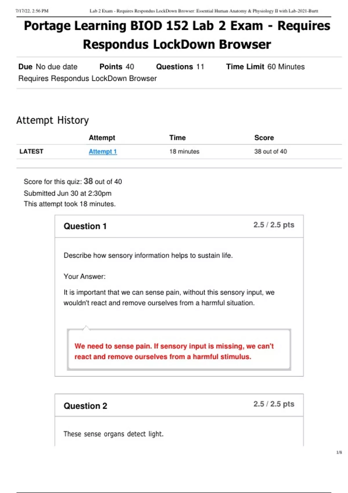 Question 1 Question 2 2.5 / 2.5 pts Portage Learning BIOD 152 Lab 2 Exam - Requires Respondus LockDown Browser Due No due date Points 40 Questions 11 Time Limit 60 Minutes Requires Respondus LockDown Browser Attempt History Attempt Time Score LATEST Attempt 1 18 minutes 38 out of 40 Score for this quiz: 38 out of 40 Submitted Jun 30 at 2:30pm This attempt took 18 minutes. These sense organs detect light. 7/17/22, 2:56 PM Lab 2 Exam - Requires Respondus LockDown Browser: Essential Human Anatomy & Physiology II with Lab-2021-Burtt 2/8 Question 3 2.5 / 2.5 pts Name the structure above and state its division in the ear. (The structure is highlighted in blue and indicated by the arrow.) Your Answer: Auricle/Pinna External division Thermoreceptors Corrrectt! Photoreceptors Chemoreceptors Nociceptors