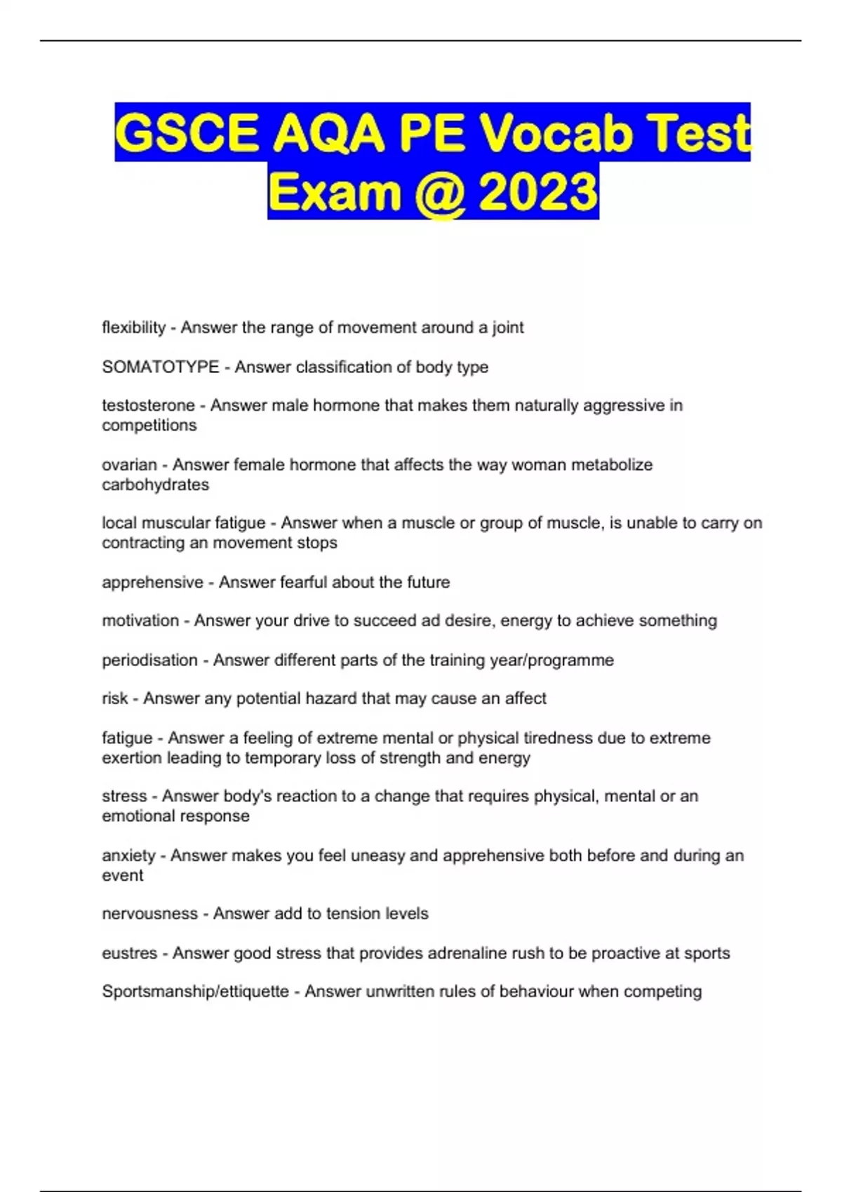 GSCE AQA PE Vocab Test Exam @ 2023...