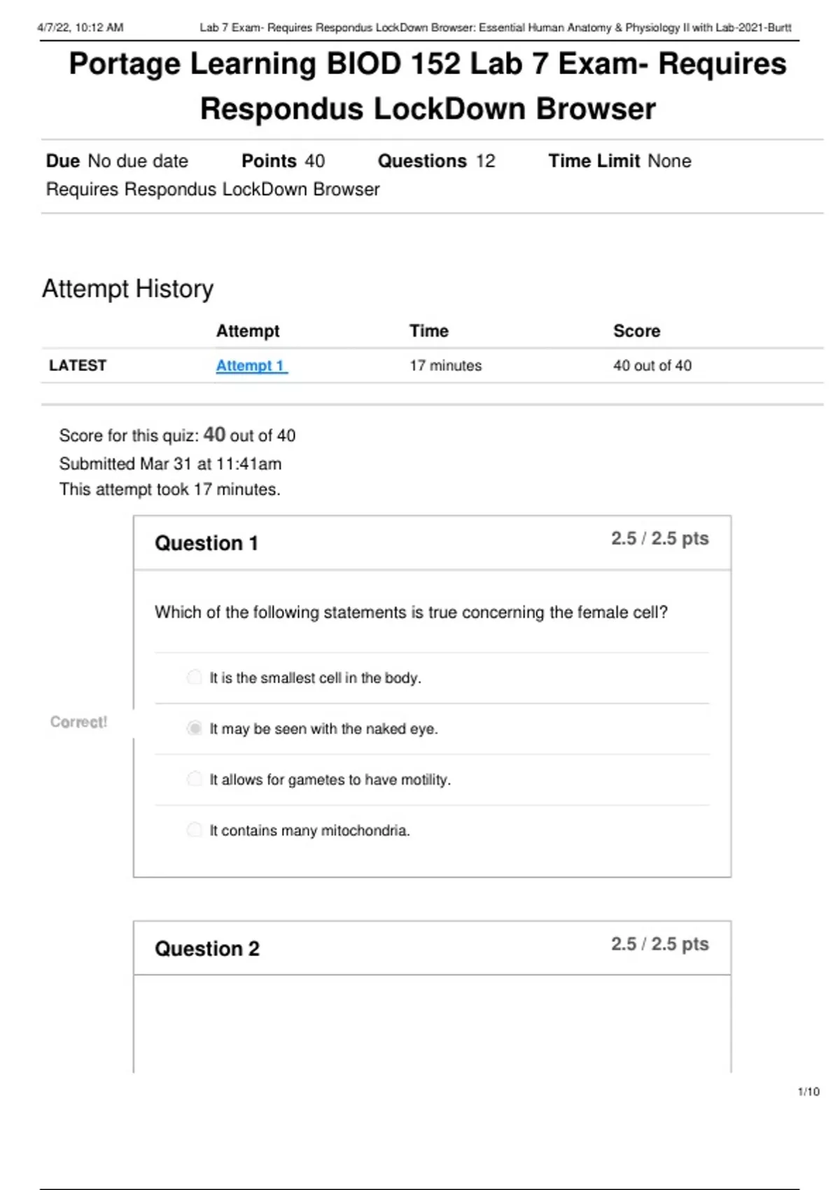 Score for this quiz: 40 out of 40 Submitted Mar 31 at 11:41am This attempt took 17 minutes. 4/7/22, 10:12 AM Lab 7 Exam- Requires Respondus LockDown Browser: Essential Human Anatomy & Physiology II with Lab-2021-Burtt 2/10 2.5 / 2.5 pts Question 3 Identify the structure and function of the structure is highlighted in blue (above). Your Answer: Epididymis; a coiled tube that allows a space for the sperm to mature and to be stored until it is ready for elimination from the body The epididymis is a coiled tube that sits around testis. It is a place for sperm to mature and be stored until elimination. 4/7/22, 10:12 AM Lab 7 Exam- Requires Respondus LockDown Browser: Essential Human Anatomy & Physiology II with Lab-2021-Burtt 3/10 2.5 / 2.5 pts Question 4 Place structures (highlighted in blue, above) in the order of the path male gametes travel from production to be expelled from the body. (Use the letters A, B, C, D) Your Answer: A D B C