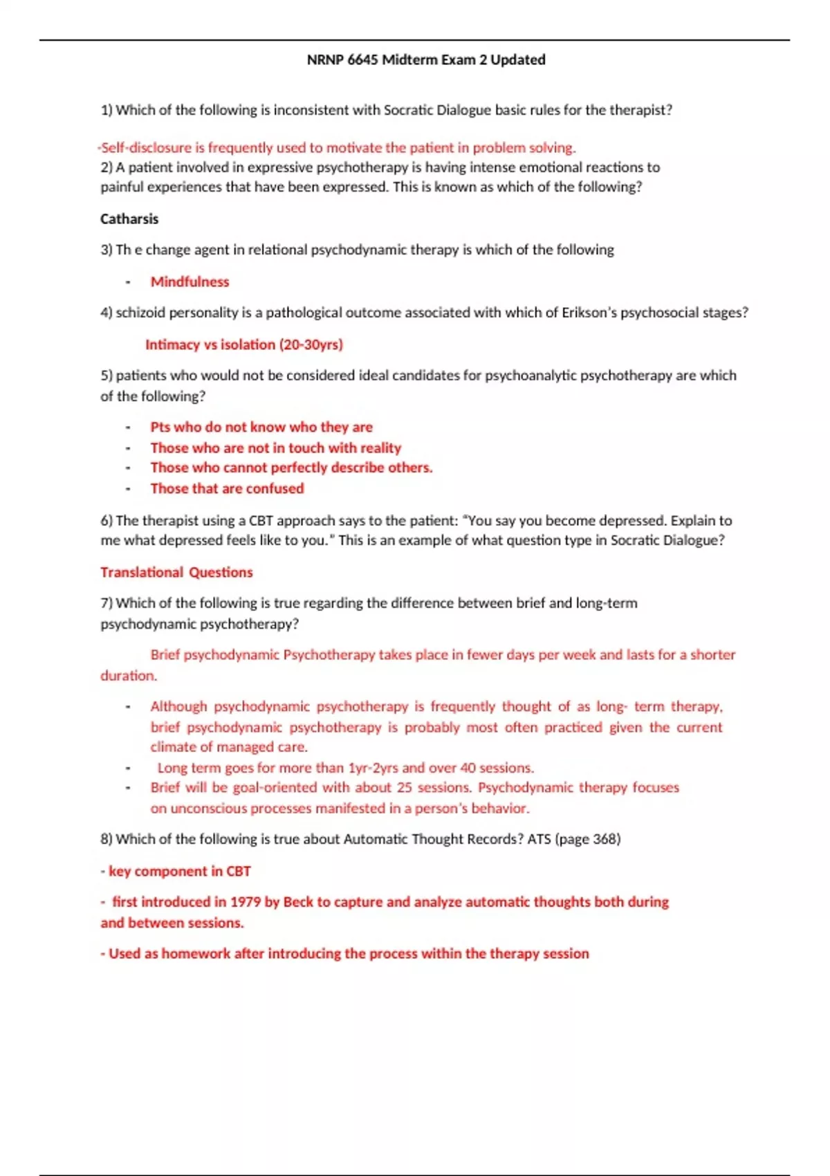 1) Which of the following is inconsistent with Socratic Dialogue basic rules for the therapist? -Self-disclosure is frequently used to motivate the patient in problem solving. 2) A patient involved in expressive psychotherapy is having intense emotional reactions to painful experiences that have been expressed. This is known as which of the following? Catharsis 3) Th e change agent in relational psychodynamic therapy is which of the following - Mindfulness 4) schizoid personality is a pathological outcome associated with which of Erikson’s psychosocial stages? Intimacy vs isolation (20-30yrs)