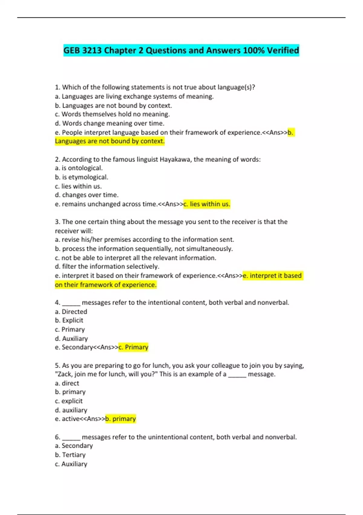 1. Which of the following statements is not true about language(s)? a. Languages are living exchange systems of meaning. b. Languages are not bound by context. c. Words themselves hold no meaning. d. Words change meaning over time. e. People interpret language based on their framework of experience.<<Ans>>b. Languages are not bound by context. 2. According to the famous linguist Hayakawa, the meaning of words: a. is ontological. b. is etymological. c. lies within us. d. changes over time. e. remains unchanged across time.<<Ans>>c. lies within us. 3. The one certain thing about the message you sent to the receiver is that the receiver will: a. revise his/her premises according to the information sent. b. process the information sequentially, not simultaneously. c. not be able to interpret all the relevant information. d. filter the information selectively. e. interpret it based on their framework of experience.<<Ans>>e. interpret it based on their framework of experience. 4. _____ messages refer to the intentional content, both verbal and nonverbal. a. Directed b. Explicit c. Primary d. Auxiliary e. Secondary<<Ans>>c. Primary 5. As you are preparing to go for lunch, you ask your colleague to join you by saying, "Zack, join me for lunch, will you?" This is an example of a _____ message. a. direct b. primary c. explicit d. auxiliary e. active<<Ans>>b. primary 6. _____ messages refer to the unintentional content, both verbal and nonverbal. a. Secondary b. Tertiary c. Auxiliary d. Implicit e. Interpretative<<Ans>>a. Secondary