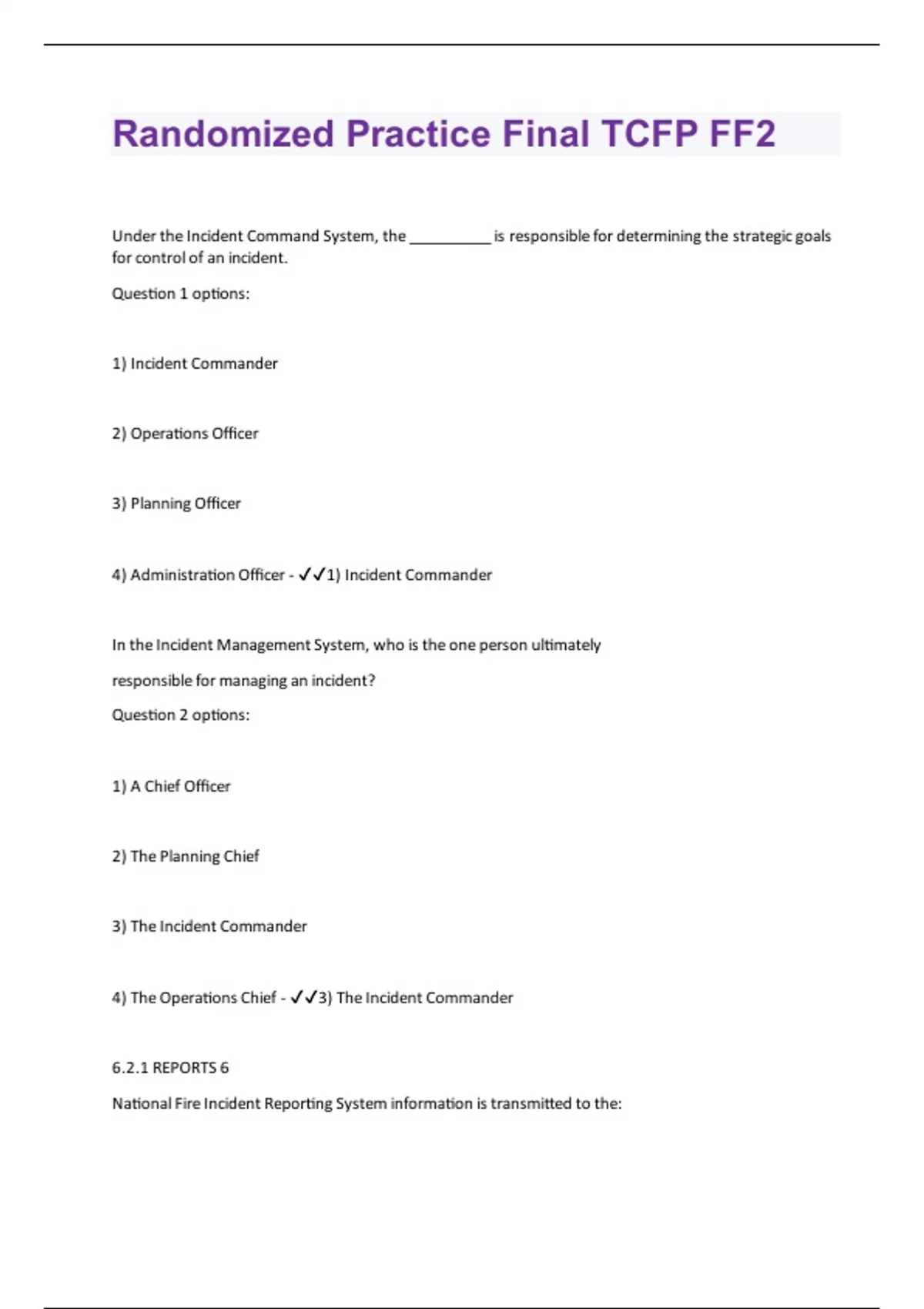 Under the Incident Command System, the __________ is responsible for determining the strategic goals for control of an incident. Question 1 options: 1) Incident Commander 2) Operations Officer 3) Planning Officer 4) Administration Officer - 1) Incident Commander In the Incident Management System, who is the one person ultimately responsible for managing an incident? Question 2 options: 1) A Chief Officer 2) The Planning Chief 3) The Incident Commander 4) The Operations Chief - 3) The Incident Commander 6.2.1 REPORTS 6 National Fire Incident Reporting System information is transmitted to the:Question