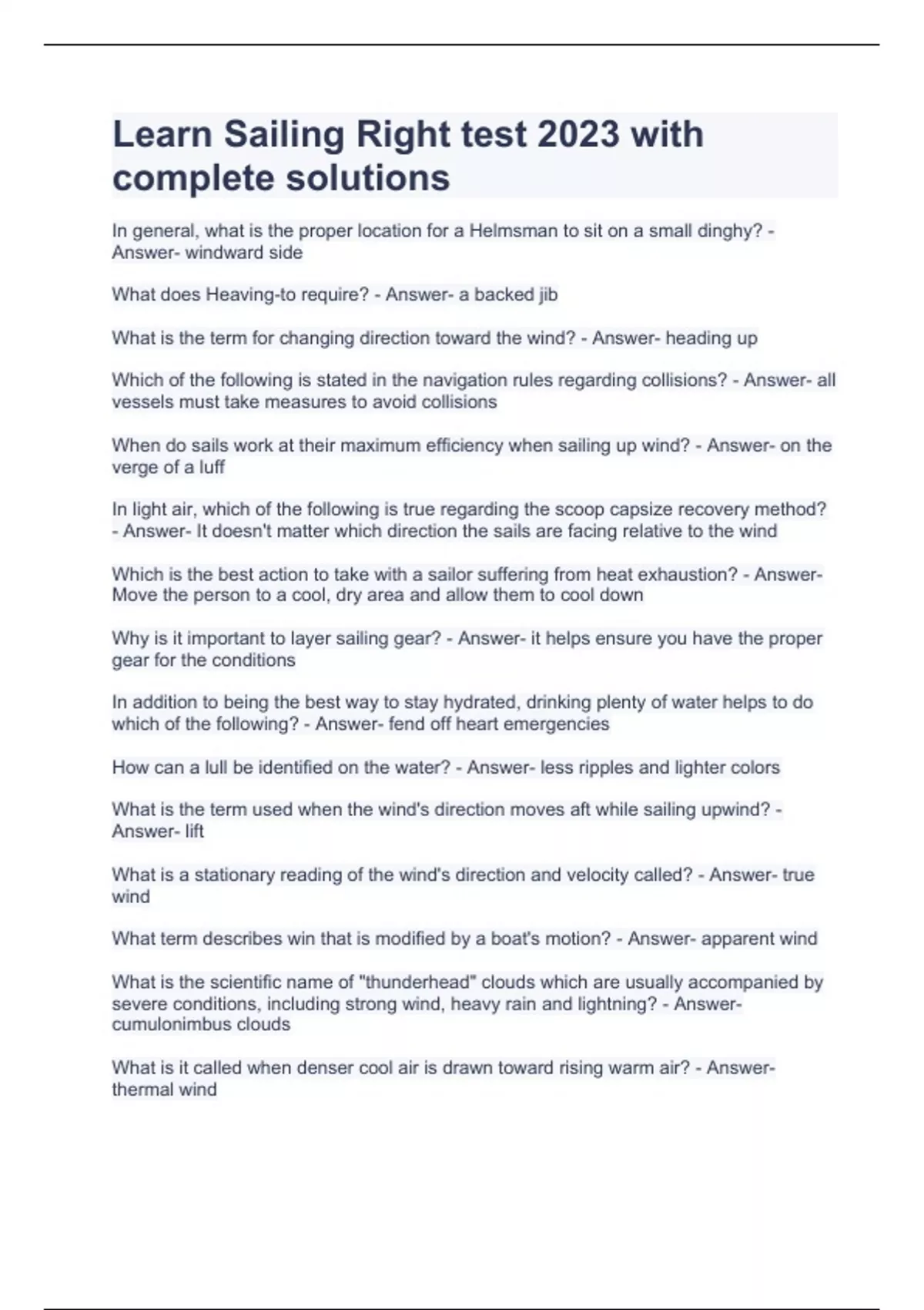 In general, what is the proper location for a Helmsman to sit on a small dinghy? - Answer- windward side What does Heaving-to require? - Answer- a backed jib What is the term for changing direction toward the wind? - Answer- heading up Which of the following is stated in the navigation rules regarding collisions? - Answer- all vessels must take measures to avoid collisions When do sails work at their maximum efficiency when sailing up wind? - Answer- on the verge of a luff In light air, which of the following is true regarding the scoop capsize recovery method? - Answer- It doesn't matter which direction the sails are facing relative to the wind Which is the best action to take with a sailor suffering from heat exhaustion? - Answer- Move the person to a cool, dry area and allow them to cool down Why is it important to layer sailing gear? - Answer- it helps ensure you have the proper gear for the conditions In addition to being the best way to stay hydrated, drinking plenty of water helps to do which of the following? - Answer- fend off heart emergencies How can a lull be identified on the water? - Answer- less ripples and lighter colors What is the term used when the wind's direction moves aft while sailing upwind? - Answer- lift What is a stationary reading of the wind's direction and velocity called? - Answer- true wind What term describes win that is modified by a boat's motion? - Answer- apparent wind What is the scientific name of "thunderhead" clouds which are usually accompanied by severe conditions, including strong wind, heavy rain and lightning? - Answer- cumulonimbus clouds What is it called when denser cool air is drawn toward rising warm air? - Answer- thermal wind Which of the following is the definition of current? - Answer- horizontal movement of water The leading edge of the sail is called - Answer- luff