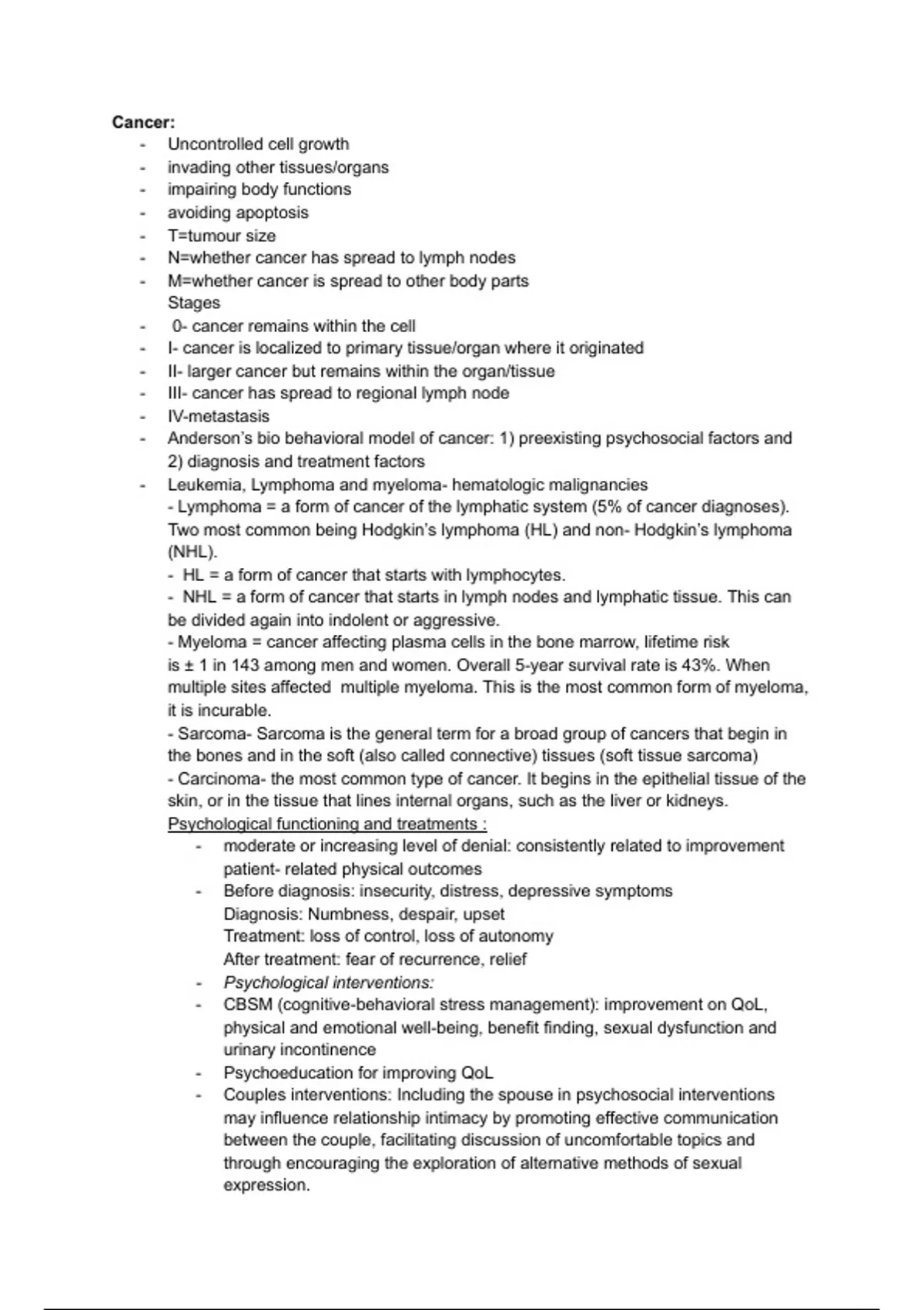 This is a summary of all medical diseases included in the course Clinical Health Psychology in Medical Science. Psychological problems that may occur and interventions for those problems are described after each disease. Information is used from the book and the slides. At the end of the document, you will also find a summary of the scientific article required for this course. This summary will help you to organise all the material in your head. I passed the course with a good grade (8.0) from the 1st opportunity. I hope my notes will help you get an even better grade. :)