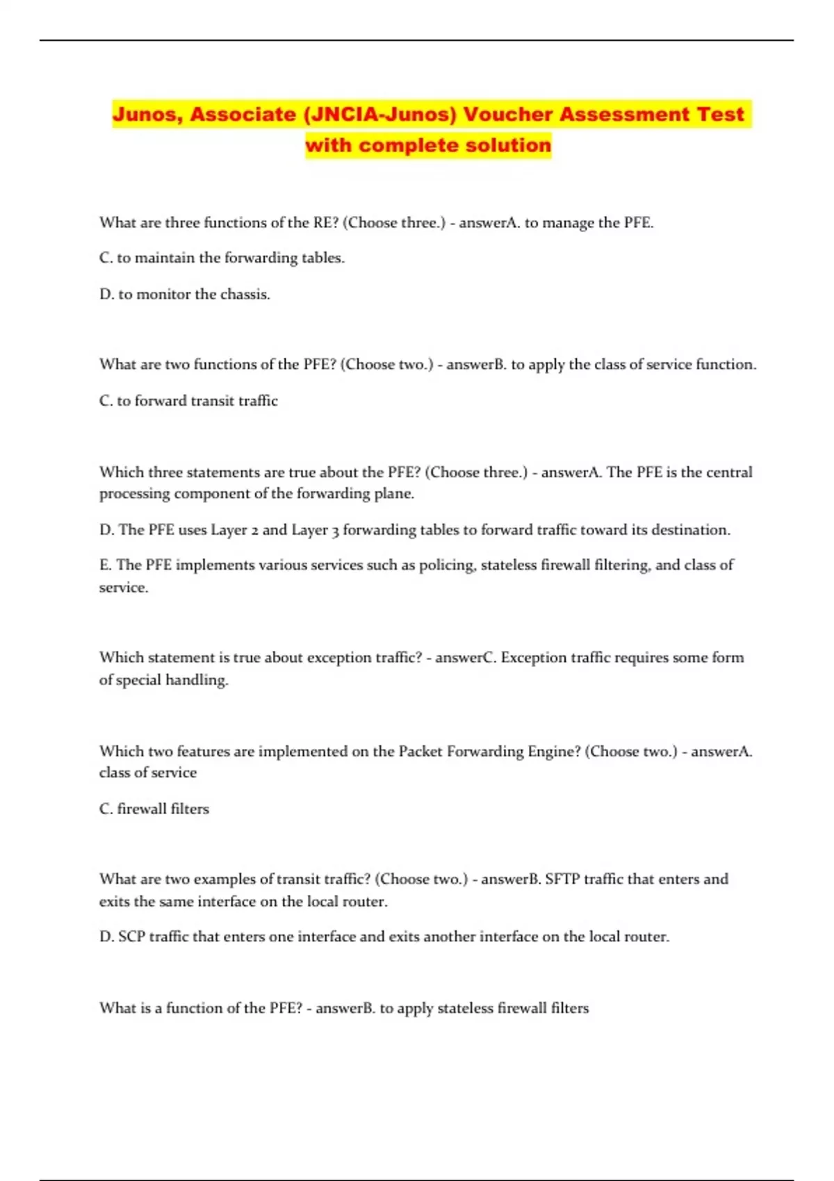 Junos, Associate (JNCIA-Junos) Voucher Assessment Test with complete solution What are three functions of the RE? (Choose three.) - answerA. to manage the PFE. C. to maintain the forwarding tables. D. to monitor the chassis. What are two functions of the PFE? (Choose two.) - answerB. to apply the class of service function. C. to forward transit traffic Which three statements are true about the PFE? (Choose three.) - answerA. The PFE is the central processing component of the forwarding plane. D. The PFE uses Layer 2 and Layer 3 forwarding tables to forward traffic toward its destination. E. The PFE implements various services such as policing, stateless firewall filtering, and class of service. Which statement is true about exception traffic? - answerC. Exception traffic requires some form of special handling. Which two features are implemented on the Packet Forwarding Engine? (Choose two.) - answerA. class of service C. firewall filters What are two examples of transit traffic? (Choose two.) - answerB. SFTP traffic that enters and exits the same interface on the local router. D. SCP traffic that enters one interface and exits another interface on the local router. What is a function of the PFE? - answerB. to apply stateless firewall filters What is an "X" release of the Junos OS? - answerB. a special feature release When considering the Junos 14.2R3.2 release, what is the correct order for each designator? - answerB. [main release number] . [minor release number] [software release] [build number] . [spin number]