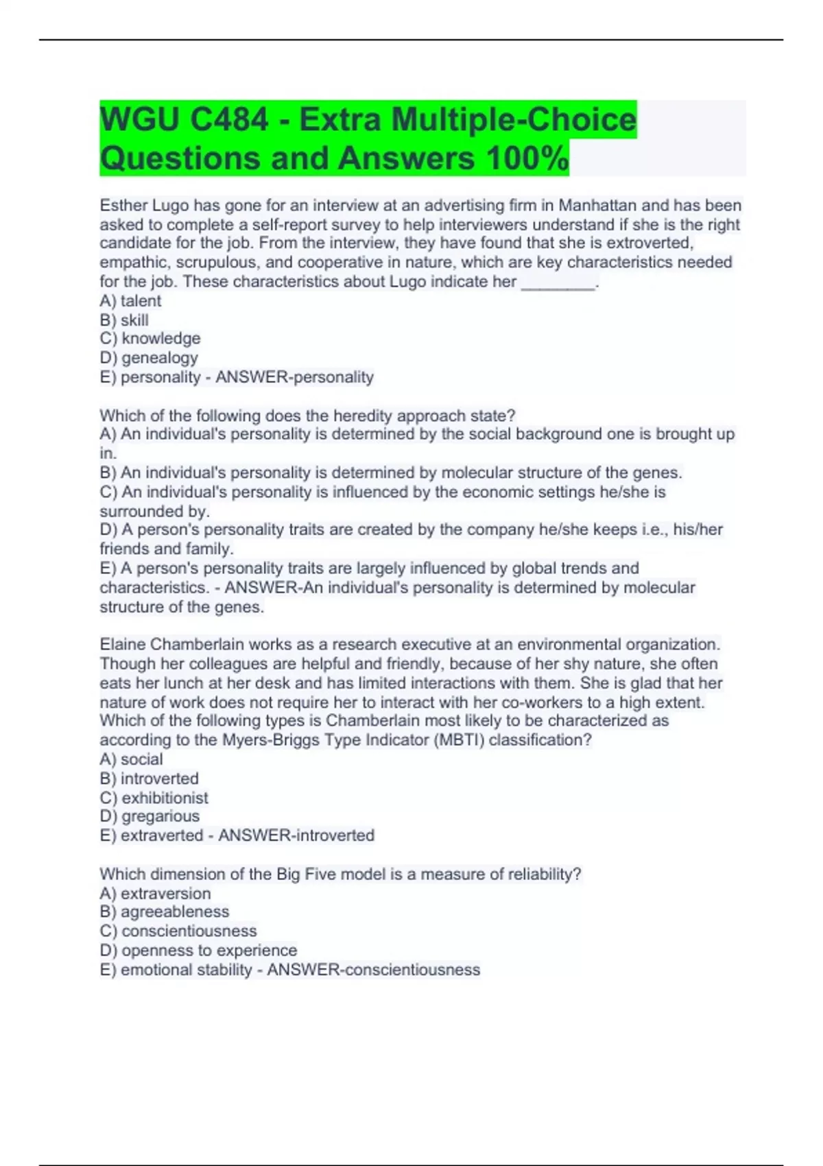Esther Lugo has gone for an interview at an advertising firm in Manhattan and has been asked to complete a self-report survey to help interviewers understand if she is the right candidate for the job. From the interview, they have found that she is extroverted, empathic, scrupulous, and cooperative in nature, which are key characteristics needed for the job. These characteristics about Lugo indicate her ________. A) talent B) skill C) knowledge D) genealogy E) personality - ANSWER-personality Which of the following does the heredity approach state? A) An individual's personality is determined by the social background one is brought up in. B) An individual's personality is determined by molecular structure of the genes. C) An individual's personality is influenced by the economic settings he/she is surrounded by. D) A person's personality traits are created by the company he/she keeps i.e., his/her friends and family. E) A person's personality traits are largely influenced by global trends and characteristics. - ANSWER-An individual's personality is determined by molecular structure of the genes. Elaine Chamberlain works as a research executive at an environmental organization. Though her colleagues are helpful and friendly, because of her shy nature, she often eats her lunch at her desk and has limited interactions with them. She is glad that her nature of work does not require her to interact with her co-workers to a high extent. Which of the following types is Chamberlain most likely to be characterized as according to the Myers-Briggs Type Indicator (MBTI) classification? A) social B) introverted C) exhibitionist D) gregarious E) extraverted - ANSWER-introverted Which dimension of the Big Five model is a measure of reliability? A) extraversion B) agreeableness C) conscientiousness D) openness to experience E) emotional stability - ANSWER-conscientiousness Which of the following statements is true about people with positive core self-evaluations? A) They are committed to their goals and set ambitious goals. B) They view themselves as powerless over their environment. C) They tend to question their capabilities and capacities. D) They lack persistence to achieve goals. E) They tend to be disliked by superiors and co-workers. - ANSWER-They are committed to their goals and set ambitious goals. Individuals scoring ________ have a strong ability to adjust their behavior to external, situational factors and can behave differently in different situations. A) low on openness B) high on narcissism C) low on agreeableness D) high on self-monitoring E) low on conscientiousness - ANSWER-high on self-monitoring Milton Rokeach created the Rokeach Value Survey (RVS), which consists of two sets of values, namely ________ values and ________ values. A) instrumental; terminal B) fluid; stable C) flexible; essential D) unique; general E) flexible; enduring - ANSWER-instrumental; terminal Which of the following is an instrumental value according to the Rokeach Value Survey? A) economic success B) social recognition C) personal discipline D) happiness E) meaning in life - ANSWER-personal discipline ________ is the process by which individuals organize and interpret their sensory impressions in order to give meaning to their environment. A) Sensation B) Impression C) Apprehension D) Attribution E) Perception - ANSWER-Perception Alicia Akers works as a marketing executive. She always talks in a high pitch and often draws a lot of attention wherever she is. Which of the following statements best explains the reason behind people noticing Akers? A) Perception of reality depends on the perceiver's past experiences. B) Perception of reality depends on the perceiver's personality. C) Characteristics of the target affect people's perception. D) The time at which we observe behavior affects perception. E) Motives and interests of the perceiver affects perception of behavior. - ANSWER-Characteristics of the target affect people's perception. A manager doing performance appraisals gives more weight to recent employee behaviors than to behaviors of six or nine months earlier. This shows that the manager's perception is affected by ________ bias. A) self-serving B) availability C) impact D) distinction E) hindsight - ANSWER-availability Which of the following is an example of internally (intrinsically) caused behavior? A) An employee was late for a team meeting because of a heavy downpour. B) An employee was laid off because the company was attempting to cut costs by laying off employees. C) An employee was fired from work because he violated a company policy. D) An employee could not attend an interview because of a delayed flight. E) An employee could not come to work because he met with an accident. - ANSWER-An employee was fired from work because he violated a company policy. Janice Yoder works in an environmental campaigning organization and often needs to interact with a large team for project implementation activities. However, she always finds it difficult to work as a part of a team. She always seems to have major disagreements with team members which lead to antagonistic relations between them. Though she has moved from one team to another, her relations with colleagues always seem to be hostile and cold. How would the attribution theory describe this behavior? A) low on consensus B) high on reliability C) high on adaptability D) high on consistency E) high on distinctiveness - ANSWER-high on consistency Johanna Springer, who works as a sales executive at Pascal's Bank, is upset at the way her manager, Emma Womack, always calls her in for one-on-one meetings to discuss her underperformance. Though Springer makes a higher number of sales calls and works longer hours than last year, her sales figures are still low. She knows that the main reason behind her underperformance is the recent economic meltdown in the country. However, her manager feels that Springer's underperformance is the result of her laid-back a
