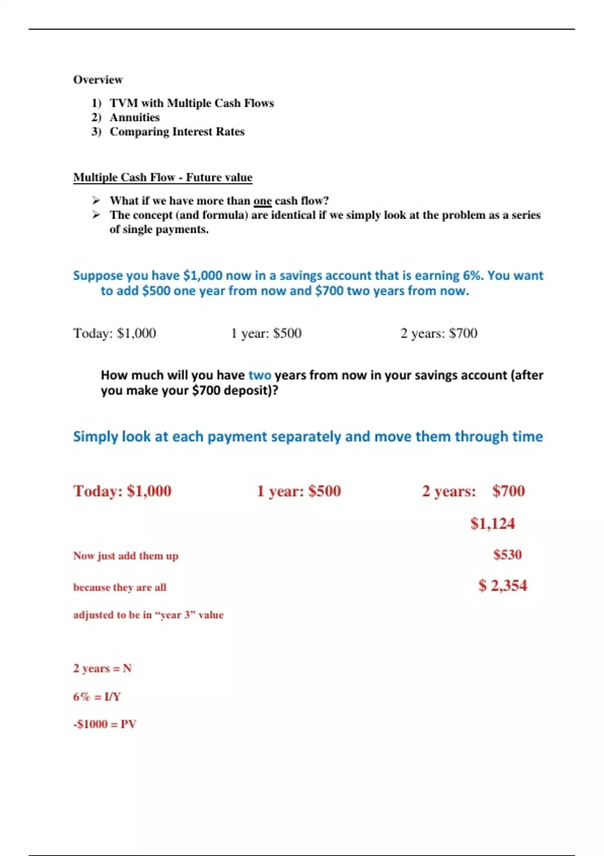1) TVM with Multiple Cash Flows 2) Annuities 3) Comparing Interest Rates • Multiple Cash Flows: Future and Present Values • Multiple Equal Cash Flows: Annuities and Perpetuities • Comparing Rates: the Effect of Compounding • Loan Types • Loan Amortization