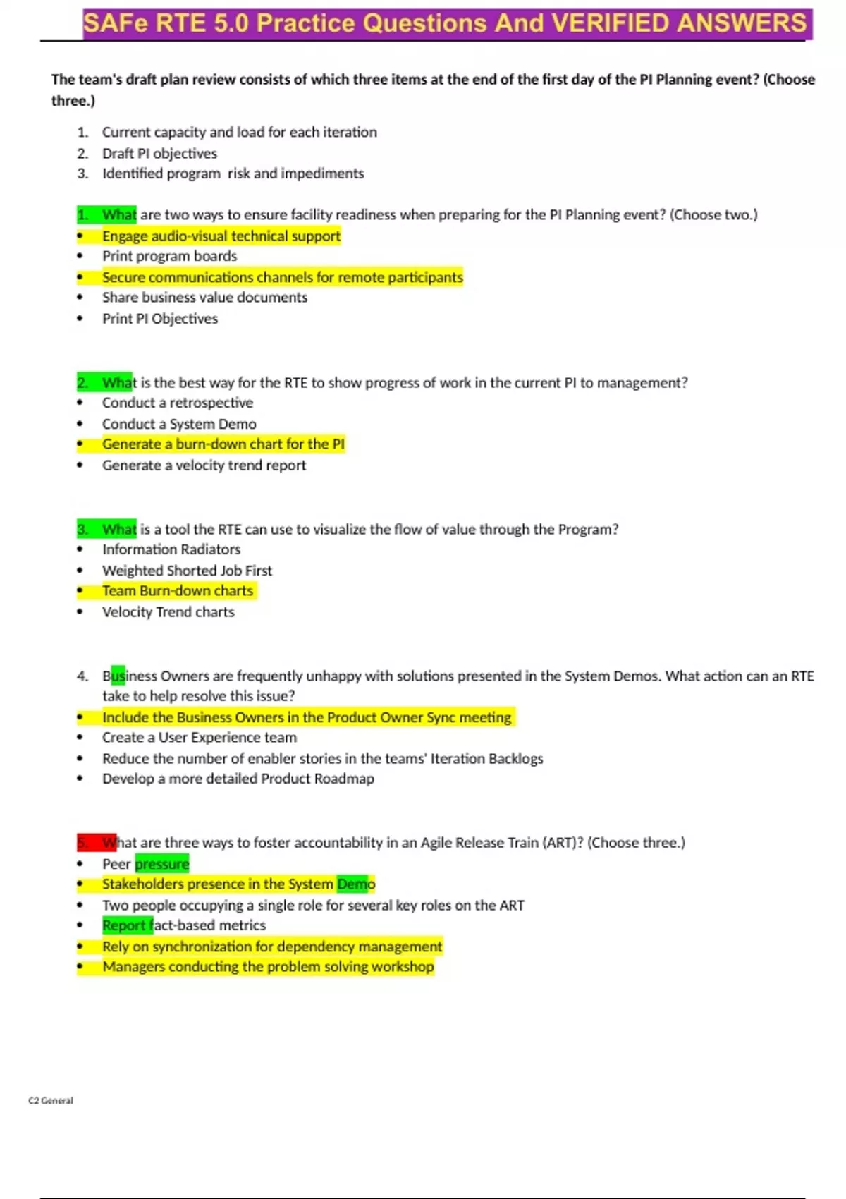 SAFe RTE 5.0 Practice Questions And Answers. ANSWERED.The team's draft plan review consists of which three items at the end of the first day of the PI Plan ning event? (Choose three.) 1. Current capacity and load for each iteration 2. Draft PI objectives 3. Identified program risk and impediments 1. What are two ways to ensure facility readiness when preparing for the PI Planning event? (Choose two.) Engage audio-visual technical support Print program boards Secure communications channels for remote participants Share business value documents Print PI Objectives 2. What is the best way for the RTE to show progress of work in the current PI to management? Conduct a retrospective Conduct a System Demo Generate a burn-down chart for the PI Generate a velocity trend report 3. What is a tool the RTE can use to visualize the flow of value through the Program? Information Radiators Weighted Shorted Job First Team Burn-down charts Velocity Trend charts 4. Business Owners are frequently unhappy with solutions presented in the System Demos. What action can an RTE take to help resolve this issue? Include the Business Owners in the Product Owner Sync meeting Create a User Experience team