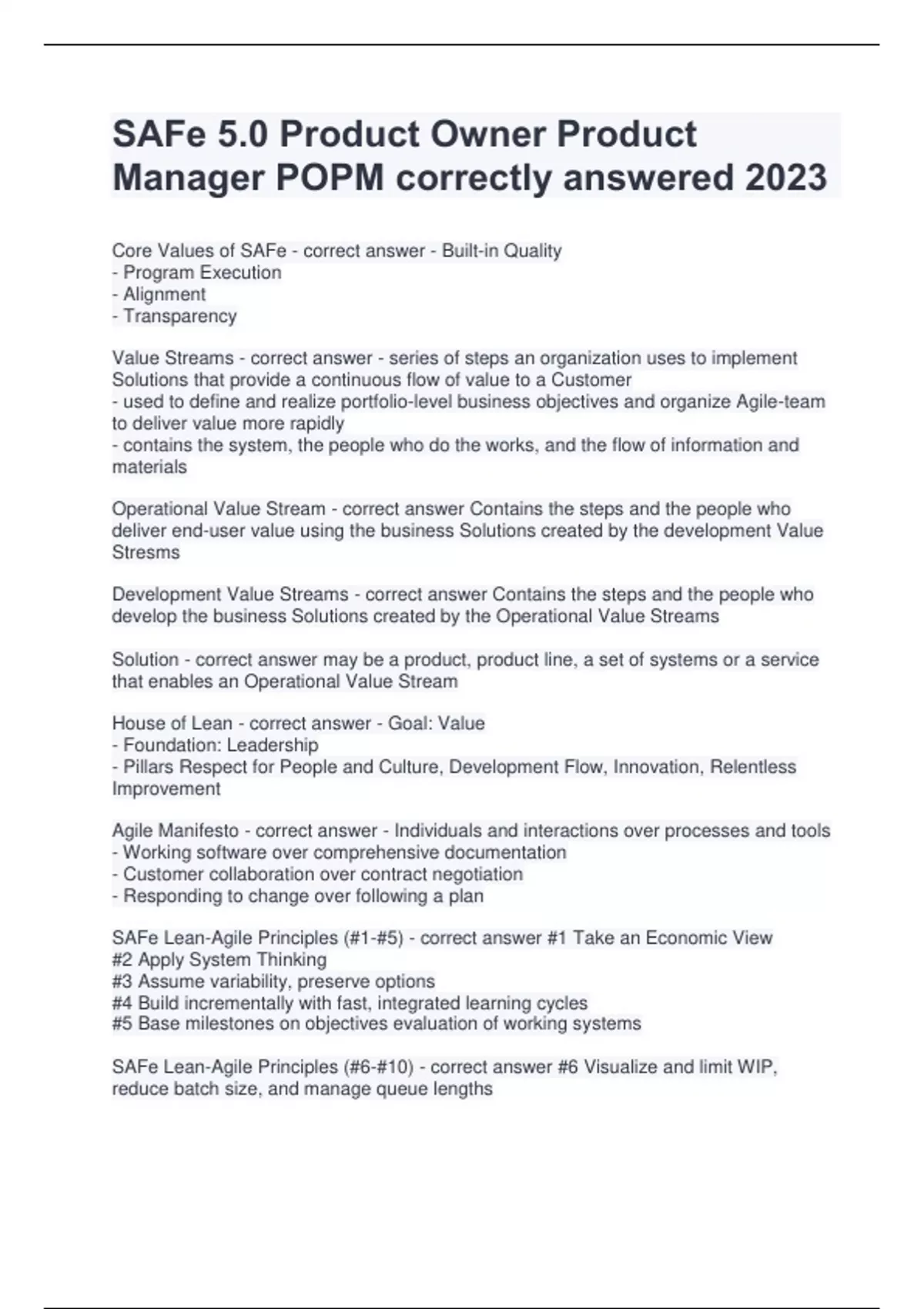 SAFe 5.0 Product Owner Product Manager POPM correctly answered 2023