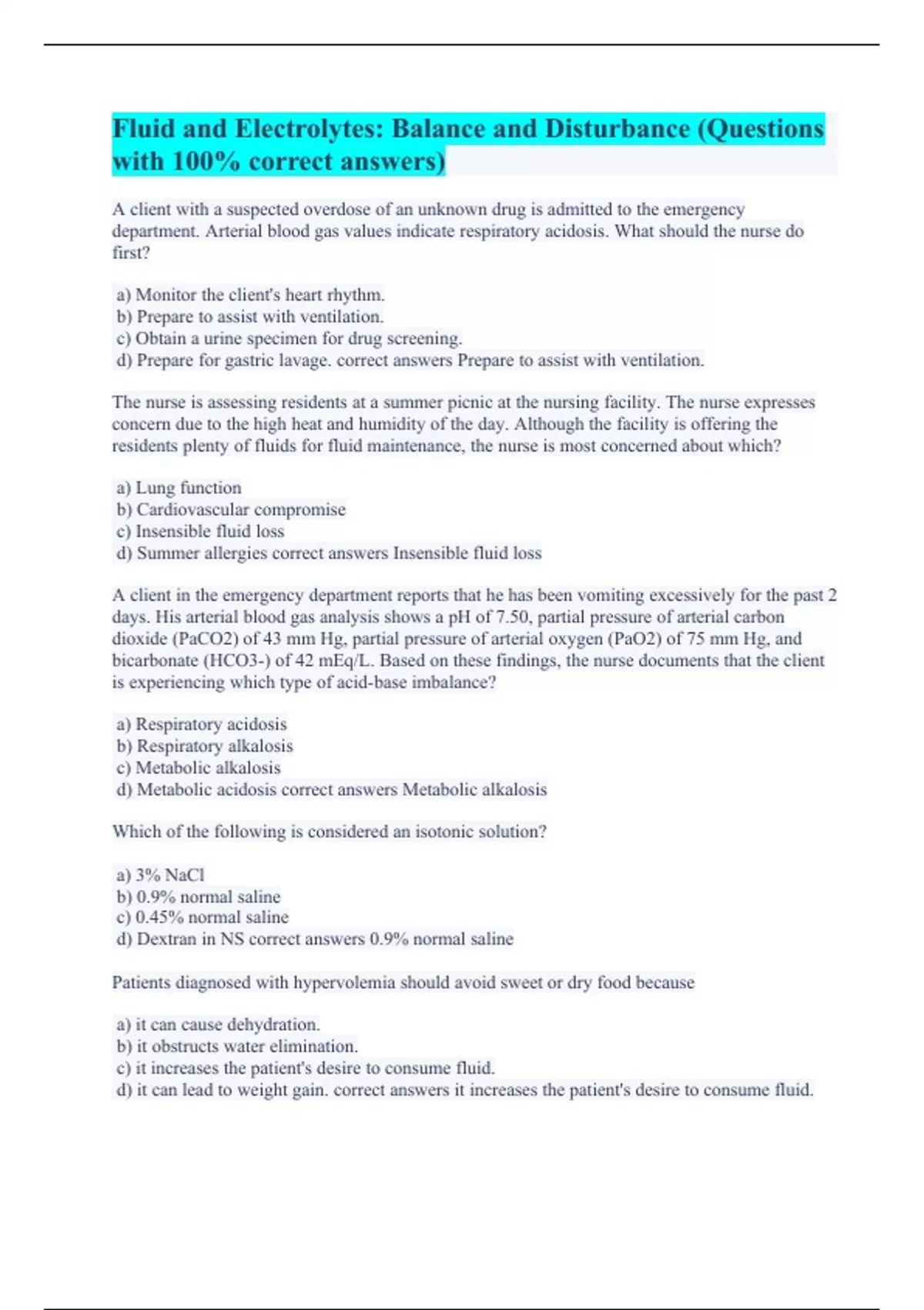 A client with a suspected overdose of an unknown drug is admitted to the emergency department. Arterial blood gas values indicate respiratory acidosis. What should the nurse do first? a) Monitor the client's heart rhythm. b) Prepare to assist with ventilation. c) Obtain a urine specimen for drug screening. d) Prepare for gastric lavage. correct answers Prepare to assist with ventilation. The nurse is assessing residents at a summer picnic at the nursing facility. The nurse expresses concern due to the high heat and humidity of the day. Although the facility is offering the residents plenty of fluids for fluid maintenance, the nurse is most concerned about which? a) Lung function b) Cardiovascular compromise c) Insensible fluid loss d) Summer allergies correct answers Insensible fluid loss A client in the emergency department reports that he has been vomiting excessively for the past 2 days. His arterial blood gas analysis shows a pH of 7.50, partial pressure of arterial carbon dioxide (PaCO2) of 43 mm Hg, partial pressure of arterial oxygen (PaO2) of 75 mm Hg, and bicarbonate (HCO3-) of 42 mEq/L. Based on these findings, the nurse documents that the client is experiencing which type of acid-base imbalance? a) Respiratory acidosis b) Respiratory alkalosis c) Metabolic alkalosis d) Metabolic acidosis correct answers Metabolic alkalosis Which of the following is considered an isotonic solution? a) 3% NaCl b) 0.9% normal saline c) 0.45% normal saline d) Dextran in NS correct answers 0.9% normal saline Patients diagnosed with hypervolemia should avoid sweet or dry food because a) it can cause dehydration. b) it obstructs water elimination. c) it increases the patient's desire to consume fluid. d) it can lead to weight gain. correct answers it increases the patient's desire to consume fluid.
