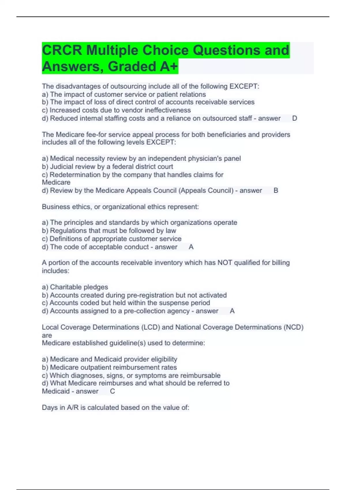CRCR Multiple Choice Questions and Answers, Graded A+ The disadvantages of outsourcing include all of the following EXCEPT: a) The impact of customer service or patient relations b) The impact of loss of direct control of accounts receivable services c) Increased costs due to vendor ineffectiveness d) Reduced internal staffing costs and a reliance on outsourced staff D The Medicare fee-for service appeal process for both beneficiaries and providers includes all of the following levels EXCEPT: a) Medical necessity review by an independent physician's panel b) Judicial review by a federal district court c) Redetermination by the company that handles claims for Medicare d) Review by the Medicare Appeals Council (Appeals Council) B Business ethics, or organizational ethics represent: a) The principles and standards by which organizations operate b) Regulations that must be followed by law c) Definitions of appropriate customer service d) The code of acceptable conduct A A portion of the accounts receivable inventory which has NOT qualified for billing includes: a) Charitable pledges b) Accounts created during pre-registration but not activated c) Accounts coded but held within the suspense period d) Accounts assigned to a pre-collection agency A Local Coverage Determinations (LCD) and National Coverage Determinations (NCD) are Medicare established guideline(s) used to determine: a) Medicare and Medicaid provider eligibility b) Medicare outpatient reimbursement rates c) Which diagnoses, signs, or symptoms are reimbursable d) What Medicare reimburses and what should be referred to Medicaid C Days in A/R is calculated based on the value of: a) The total accounts receivable on a specific date b) Total anticipated revenue minus expenses c) The time it takes to collect anticipated revenue d) Total cash received to date C Patients are contacting hospitals to proactively inquire about costs and fees prior to agreeing to service. The problem for hospitals in providing such information is: a) That hospitals don't want to establish a price without knowing if the patient has insurance and how much reimbursement can be expected b) The fact that charge master lists the total charge, not net charges that reflect charges after a payer's contractual adjustment c) That hospitals don't want to be put in the position of "guaranteeing" price without having room for additional charges that may arise in the course of treatment d) Their reluctance to share proprietary information B Across all care settings, if a patient consents to a financial discussion during a medical encounter to expedite discharge, the HFMA best practice is to: a) Make sure that the attending staff can answer questions and assist in obtaining required patient financial data b) Have a patient financial responsibilities kit ready for the patient, containing all of the required registration forms and instructions c) Support that choice, providing that the discussion does not interfere with patient care or disrupt patient flow d) Decline such request as finance discussions can disrupt patient care and patient flow C A comprehensive "Compliance Program" is defined as a) Annual legal audit and review for adherence to regulations b) Educating staff on regulations c) Systematic procedures to ensure that the provisions of regulations imposed by a government agency are being met d) The development of operational policies that correspond to regulations C Case Management requires that a case manager be assigned a) To patients of any physician requesting case management b) To a select patient group c) To every patient d) To specific cases designated by third party contractual agreement B Pricing transparency is defined as readily available information on the price of healthcare services, that together with other information, help define the value of those services and enable consumers to a) Identify, compare, and choose providers that offer the desired level of value b) Customize health care with a personally chosen mix of providers c) Negotiate the cost of health plan premiums d) Verify the cost of individual clinicians A Any healthcare insurance plan that provides or ensures comprehensive health maintenance and treatment services for an enrolled group of persons based on a monthly fee is known as a a) MSO b) HMO c) PPO d) GPO B In a Chapter 7 Straight Bankruptcy filing a) The court liquidates the debtor's nonexempt property, pays creditors, and discharges the debtor from the debt b) The court liquidates the debtor's nonexempt property, pays creditors, and begins to pay off the largest claims first. All claims are paid some portion of the amount owed c) The court vacates all claims against a debtor with the understanding that the debtor may not apply for credit without court supervision d) The court establishes a creditor payment schedule with the longest outstanding claims paid first A The core financial activities resolved within patient access include: a) Scheduling, pre-registration, insurance verification and managed care processing b) Scheduling, insurance verification, clinical discharge processing and payment posting of point of service receipts c) Scheduling, registration, charge entry and managed care processing d) Scheduling, pre-registration, registration, medical necessity screening and patient refunds A Which of the following is NOT contained in a collection agency agreement? a) A clear understanding that the provider retains ownership of any outsourced activities b) Specific language as to who will pay legal fees, if needed c) An annual renewal clause d) A mutual hold-harmless clause D Maintaining routine contact with the health plan or liability payer, making sure all required information is provided and all needed approvals are obtained is the responsibility of: a) Patient Accounts b) Managed Care Contract Staff c) HIM staff d) Case Management D What is required for the UB-04/837-I, used by Rural Health Clinics to generate payment from Me