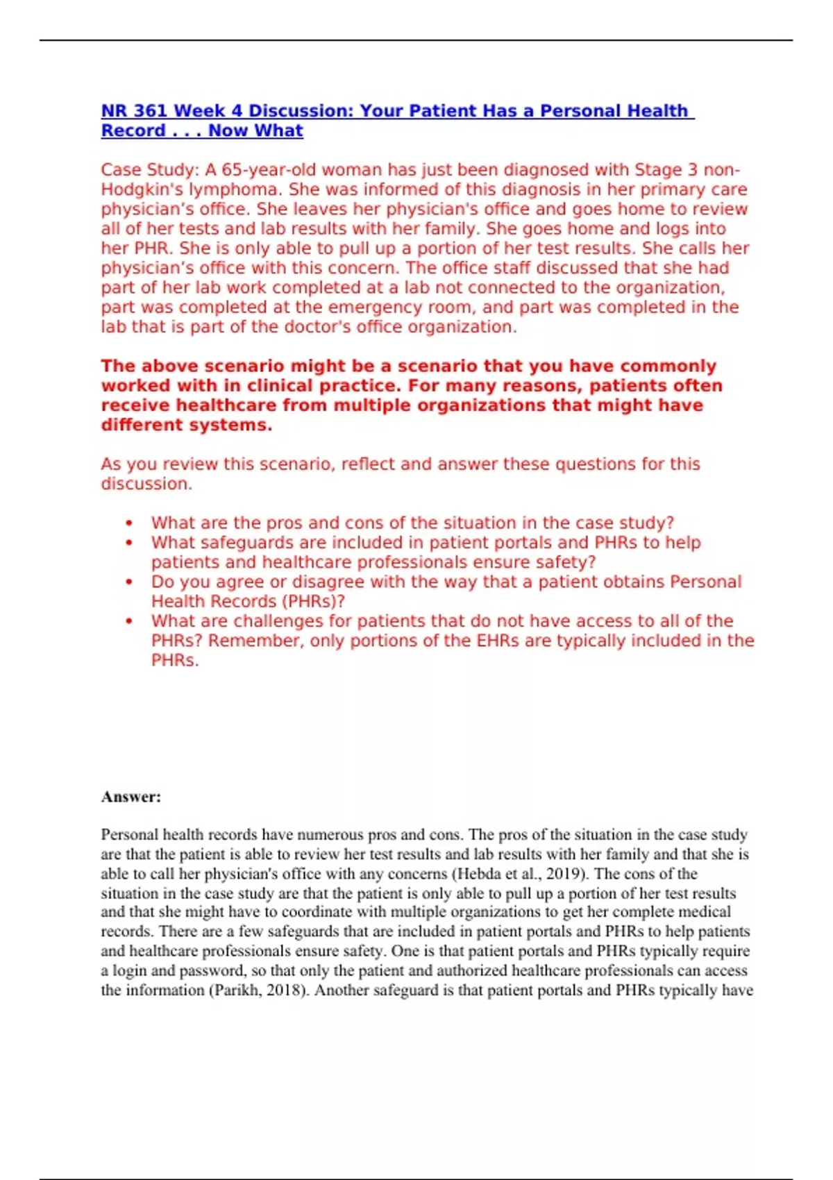 NR 361 Week 4 Discussion: Your Patient Has a Personal Health Record . . . Now What Case Study: A 65-year-old woman has just been diagnosed with Stage 3 non-Hodgkin's lymphoma. She was informed of this diagnosis in her primary care physician’s office. She leaves her physician's office and goes home to review all of her tests and lab results with her family. She goes home and logs into her PHR. She is only able to pull up a portion of her test results. She calls her physician’s office with this concern. The office staff discussed that she had part of her lab work completed at a lab not connected to the organization, part was completed at the emergency room, and part was completed in the lab that is part of the doctor's office organization. The above scenario might be a scenario that you have commonly worked with in clinical practice. For many reasons, patients often receive healthcare from multiple organizations that might have different systems. As you review this scenario, reflect and answer these questions for this discussion. • What are the pros and cons of the situation in the case study? • What safeguards are included in patient portals and PHRs to help patients and healthcare professionals ensure safety? • Do you agree or disagree with the way that a patient obtains Personal Health Records (PHRs)? • What are challenges for patients that do not have access to all of the PHRs? Remember, only portions of the EHRs are typically included in the PHRs.