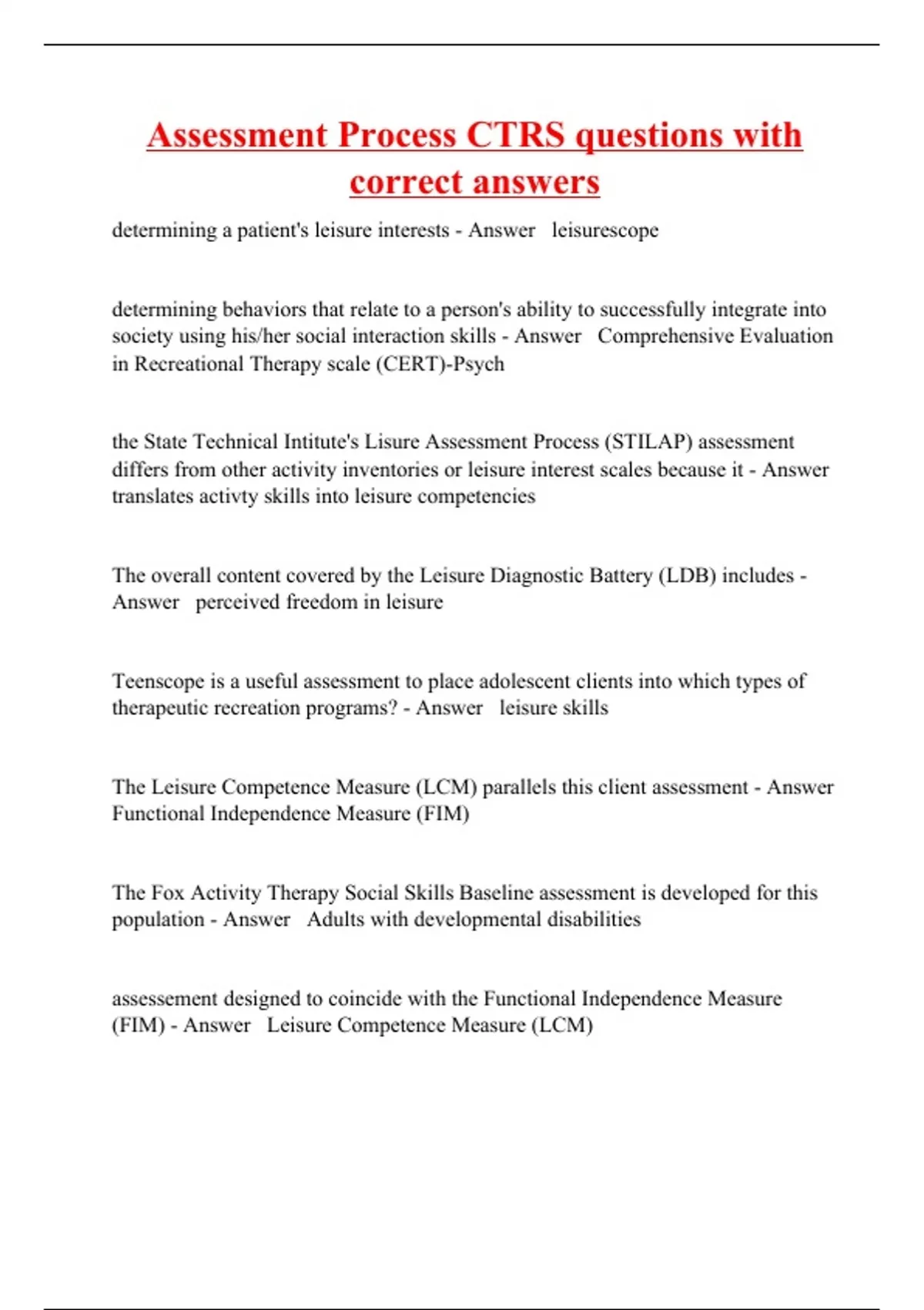 determining a patient's leisure interests - Answer leisurescope determining behaviors that relate to a person's ability to successfully integrate into society using his/her social interaction skills - Answer Comprehensive Evaluation in Recreational Therapy scale (CERT)-Psych the State Technical Intitute's Lisure Assessment Process (STILAP) assessment differs from other activity inventories or leisure interest scales because it - Answer translates activty skills into leisure competencies The overall content covered by the Leisure Diagnostic Battery (LDB) includes - Answer perceived freedom in leisure Teenscope is a useful assessment to place adolescent clients into which types of therapeutic recreation programs? - Answer leisure skills The Leisure Competence Measure (LCM) parallels this client assessment - Answer Functional Independence Measure (FIM) The Fox Activity Therapy Social Skills Baseline assessment is developed for this population - Answer Adults with developmental disabilities assessement designed to coincide with the Functional Independence Measure (FIM) - Answer Leisure Competence Measure (LCM)
