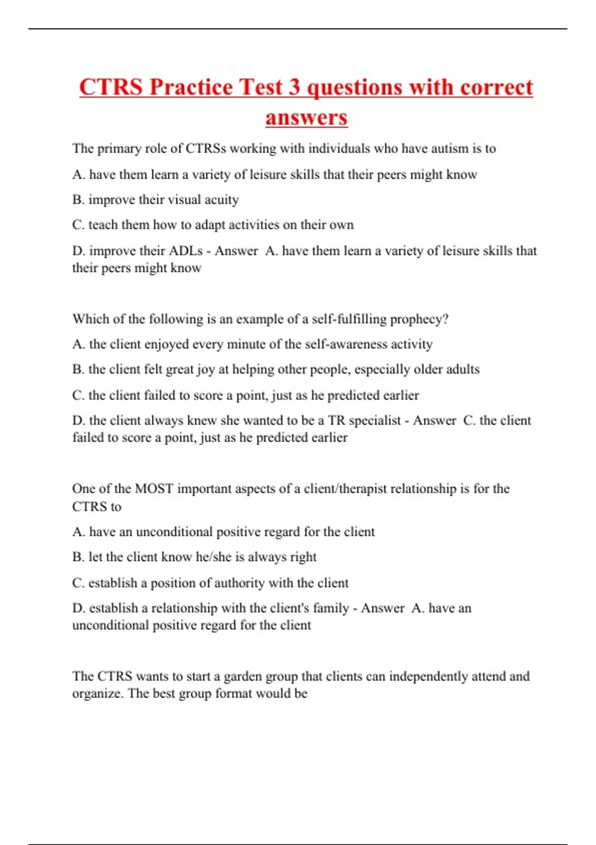 The primary role of CTRSs working with individuals who have autism is to A. have them learn a variety of leisure skills that their peers might know B. improve their visual acuity C. teach them how to adapt activities on their own D. improve their ADLs - Answer A. have them learn a variety of leisure skills that their peers might know Which of the following is an example of a self-fulfilling prophecy? A. the client enjoyed every minute of the self-awareness activity B. the client felt great joy at helping other people, especially older adults C. the client failed to score a point, just as he predicted earlier D. the client always knew she wanted to be a TR specialist - Answer C. the client failed to score a point, just as he predicted earlier One of the MOST important aspects of a client/therapist relationship is for the CTRS to A. have an unconditional positive regard for the client B. let the client know he/she is always right C. establish a position of authority with the client D. establish a relationship with the client's family - Answer A. have an unconditional positive regard for the client The CTRS wants to start a garden group that clients can independently attend and organize. The best group format would be A. instructional class