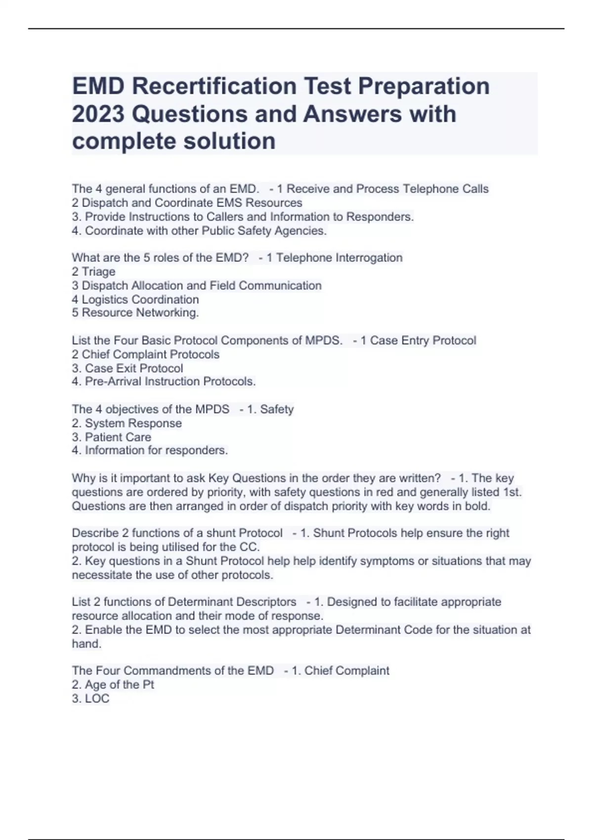 EMD Recertification Test Preparation 2023 Questions and Answers with complete solution