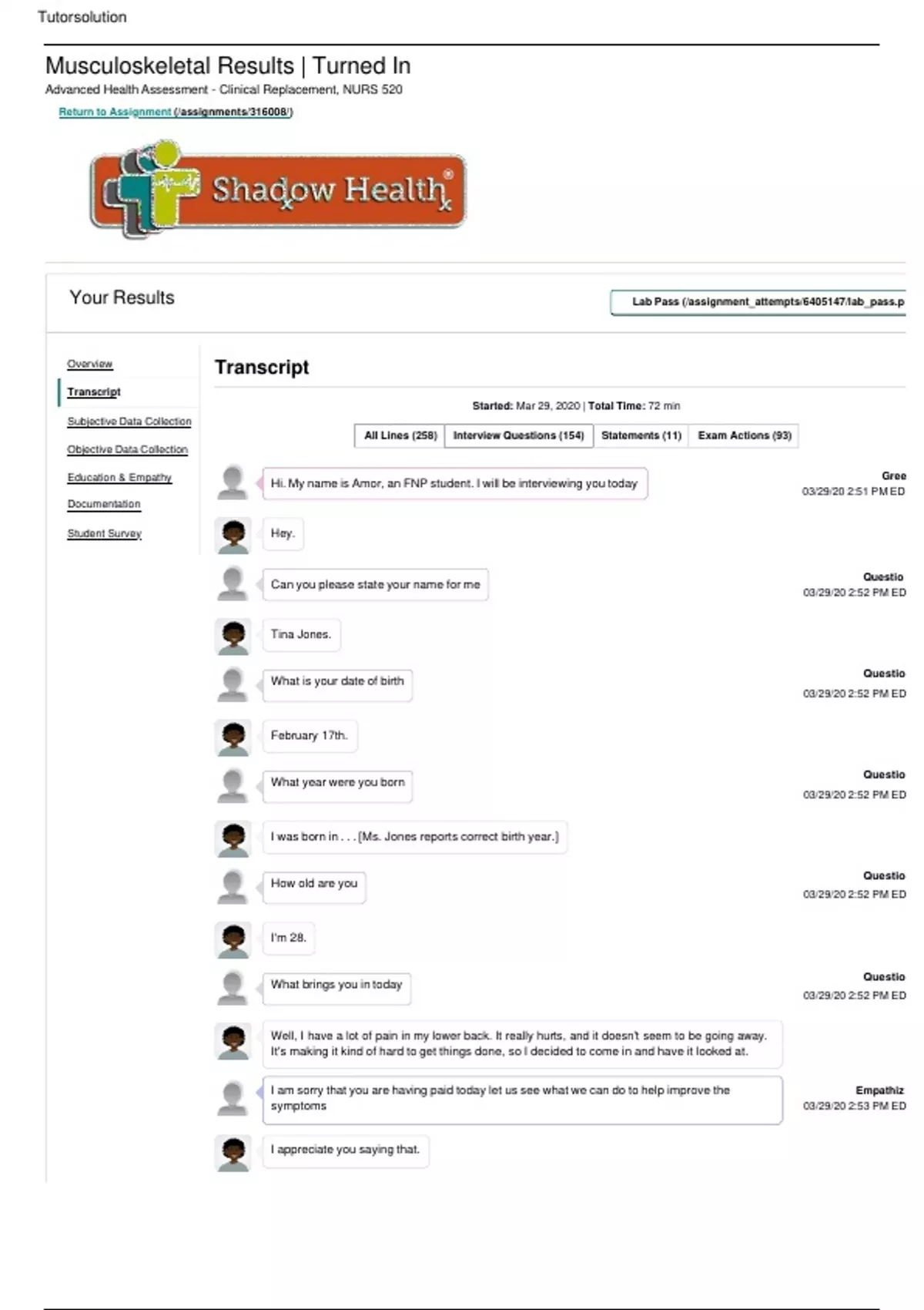 TINA JONES TRANSCRIPT Musculoskeletal Completed Shadow Health Graded A+ Musculoskeletal Results | Turned In Advanced Health Assessment - Clinical Replacement, NURS 520 Return to Assignment (/assignments//) Transcript Started: Mar 29, 2020 | Total Time: 72 min Gree 03/29/20 2:51 PM ED Question 03/29/20 2:52 PM ED Question 03/29/20 2:52 PM ED Question 03/29/20 2:52 PM ED Question 03/29/20 2:52 PM ED Question 03/29/20 2:52 PM ED Empathize 03/29/20 2:53 PM ED Your Results Lab Pass (/assignment_attempts//lab_pass.p Overview Transcript Subjective Data Collection Objective Data Collection Education & Empathy Documentation Student Survey Statements (11) Exam Actions (93) Hi. My name is Amor, an FNP student. I will be interviewing you today Hey. Can you please state your name for me Tina Jones. What is your date of birth February 17th. What year were you born I was born in . . . [Ms. Jones reports correct birth year.] How old are you I'm 28. What brings you in today Well, I have a lot of pain in my lower back. It really hurts, and it doesn't seem to be going away. It's making it kind of hard to get things done, so I decided to come in and have it looked at. I am sorry that you are having paid today let us see what we can do to help improve the symptoms I appreciate you saying that. All Lines (258) Interview Questions (154) 3/29/2020 Musculoskeletal | Completed | Shadow Health Question 03/29/20 2:53 PM ED Question 03/29/20 2:53 PM ED Question 03/29/20 2:54 PM ED Question 03/29/20 2:54 PM ED Question 03/29/20 2:54 PM ED Question 03/29/20 2:54 PM ED Question 03/29/20 2:55 PM ED Question 03/29/20 2:55 PM ED Question 03/29/20 2:55 PM ED Question 03/29/20 2:55 PM ED Question 03/29/20 2:56 PM ED Question 03/29/20 2:56 PM ED When did the pain start It started three days ago, right when I first tweaked my back. Tell me more about the pain It's like. . . an ache. How did the paint started (No matching questions found.) When did the pain started It started three days ago, right when I first tweaked my back. Were you doing something (No matching questions found.) Describe what it feels like (Clarified to Can you describe your pain?.) It's like. . . an ache. (Clarified to what the pain is like.) Does the pain come and go No, it's been pretty much constant. Have you had this problem before No, nothing like this has ever happened to me. . . my back is usually totally fine. How would you rate this pain in a scale of 1 to 10 (Clarified to Can you rate your current pain level on a scale of 0 to 10?.) Right now, since the Advil's wearing off, it's around a 5 out of 10. (Clarified to how I would rate my pain on a scale.) Were you doing something when this happened (Clarified to Did anything happen to cause the pain?.) Yeah, I think I tweaked it lifting up a box. (Clarified to if anything happened to cause the pain.) Does the pain limit your movement It hurts to move, but I can do it. Are you in pain right now Yes! My back feels really bad right now.