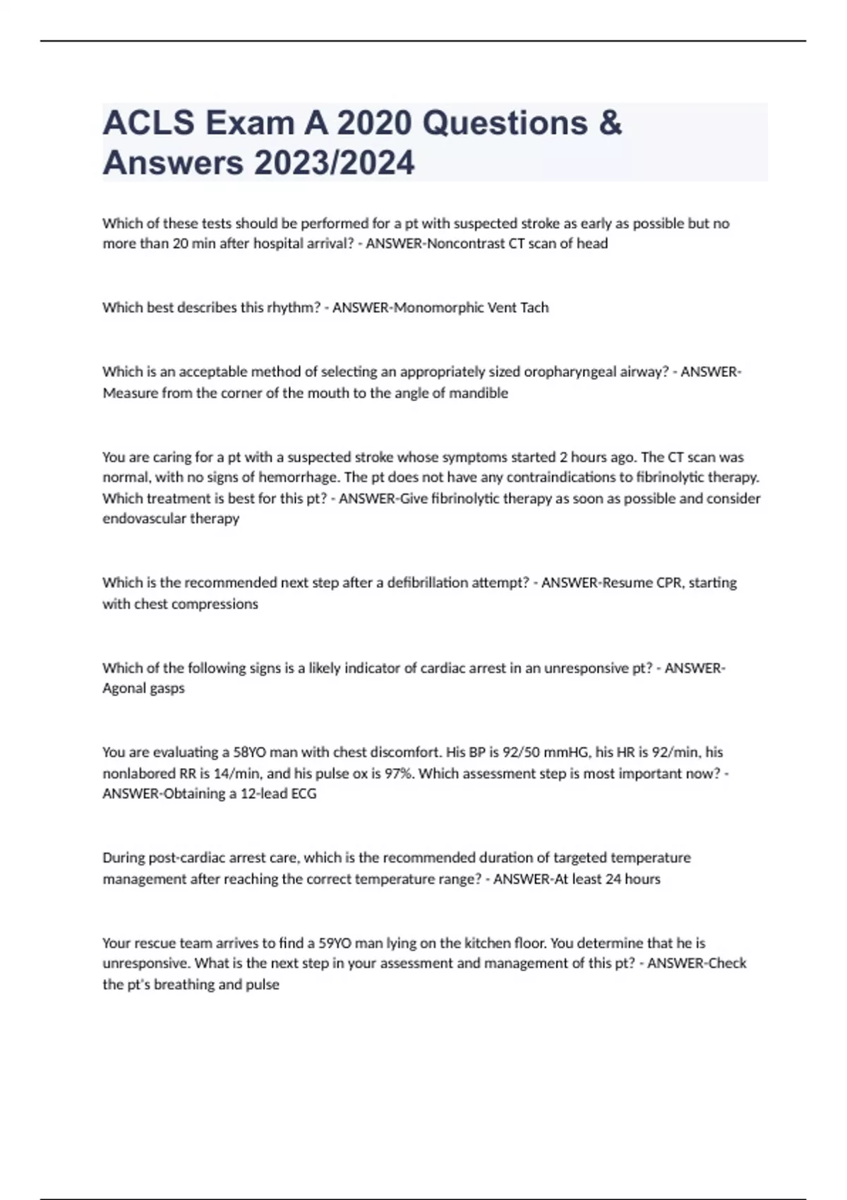 ACLS Exam A 2020 Questions & Answers 2023/2024 Which of these tests should be performed for a pt with suspected stroke as early as possible but no more than 20 min after hospital arrival? - ANSWER-Noncontrast CT scan of head Which best describes this rhythm? - ANSWER-Monomorphic Vent Tach Which is an acceptable method of selecting an appropriately sized oropharyngeal airway? - ANSWER-Measure from the corner of the mouth to the angle of mandible You are caring for a pt with a suspected stroke whose symptoms started 2 hours ago. The CT scan was normal, with no signs of hemorrhage. The pt does not have any contraindications to fibrinolytic therapy. Which treatment is best for this pt? - ANSWER-Give fibrinolytic therapy as soon as possible and consider endovascular therapy Which is the recommended next step after a defibrillation attempt? - ANSWER-Resume CPR, starting with chest compressions Which of the following signs is a likely indicator of cardiac arrest in an unresponsive pt? - ANSWER-Agonal gasps You are evaluating a 58YO man with chest discomfort. His BP is 92/50 mmHG, his HR is 92/min, his nonlabored RR is 14/min, and his pulse ox is 97%. Which assessment step is most important now? - ANSWER-Obtaining a 12-lead ECG During post-cardiac arrest care, which is the recommended duration of targeted temperature management after reaching the correct temperature range? - ANSWER-At least 24 hours Your rescue team arrives to find a 59YO man lying on the kitchen floor. You determine that he is unresponsive. What is the next step in your assessment and management of this pt? - ANSWER-Check the pt's breathing and pulse