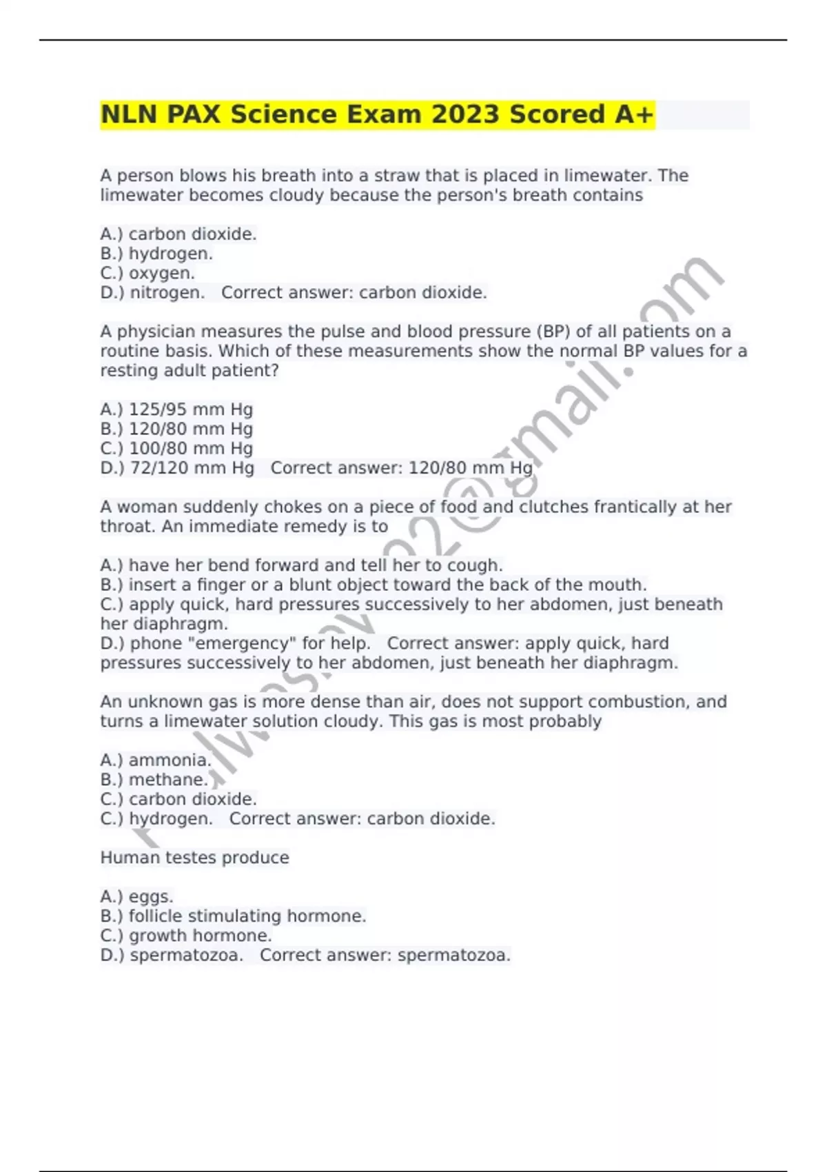 NLN PAX Science Exam 2023 Scored A+ A person blows his breath into a straw that is placed in limewater. The limewater becomes cloudy because the person's breath contains A.) carbon dioxide. B.) hydrogen. C.) oxygen. D.) nitrogen. Correct answer: carbon dioxide. A physician measures the pulse and blood pressure (BP) of all patients on a routine basis. Which of these measurements show the normal BP values for a resting adult patient? A.) 125/95 mm Hg B.) 120/80 mm Hg C.) 100/80 mm Hg D.) 72/120 mm Hg Correct answer: 120/80 mm Hg A woman suddenly chokes on a piece of food and clutches frantically at her throat. An immediate remedy is to A.) have her bend forward and tell her to cough. B.) insert a finger or a blunt object toward the back of the mouth. C.) apply quick, hard pressures successively to her abdomen, just beneath her diaphragm. D.) phone "emergency" for help. Correct answer: apply quick, hard pressures successively to her abdomen, just beneath her diaphragm. An unknown gas is more dense than air, does not support combustion, and turns a limewater solution cloudy. This gas is most probably A.) ammonia. B.) methane. C.) carbon dioxide. C.) hydrogen. Correct answer: carbon dioxide. Human testes produce A.) eggs. B.) follicle stimulating hormone. C.) growth hormone. D.) spermatozoa. Correct answer: spermatozoa. If a red light is passed through a dilute solution of chlorophyll solution, the spectrophotometer will detect what amount of transmittance of this light? A.) 100% B.) 50 - 75% C.) Less than 25% D.) None Correct answer: 50 - 75% In diagnostic testing, the electroencephalogram permits the physician to A.) examine the impulses of the specialized muscle cells of the heart. B.) examine the impulses of the nerve cells within the brain. C.) measure the pressure within the eye. D.) measure the amount of air upon exhalation. Correct answer: examine the impulses of the nerve cells within the brain. To sterilize a metal probe in the office, a dentist could use a steam sterilizer. If unavailable, the next most effective method to sterilize the instrument would be A.) boiling it in water for 15 minutes. B.) dipping it into a concentrated acid solution. C.) heating it in a hot air oven at 160°C for 20 minutes. D.) washing it in soap and water. Correct answer: boiling it in water for 15 minutes. In varieties of matter, the term heterogeneous may be applied to A.) elements, but not compounds. B.) compounds, but not elements. C.) compounds and elements, but not mixtures. D.) mixtures, but not elements or compounds. Correct answer: mixtures, but not elements or compounds. Heat energy is absorbed in which of these phase changes? A.) Br2 (l) -> Br2(s) B.) Br2 (g) --> Br2(l) C.) Br2 (l) -> Br2(g) D.) Br2 (g) -> Br2(s) Correct answer: Br2 (l) -> Br2(g) Periodontitis is an inflammatory condition of the A.) gum tissue that surrounds the neck of each tooth. B.) pulp that contains nerve cells and blood vessels of the tooth. C.) dentin that surrounds the soft part of a tooth. D.) enamel that provides a hard surface for chewing. Correct answer: gum tissue that surrounds the neck of each tooth. The atoms of an element with seven valence electrons are most probably classified as A.) metals. B.) nonmetals. C.) metalloids. D.) noble gases. Correct answer: nonmetals. The inherited factors that are transmitted in an organism from generation to generation are called its A.) homozygote. B.) heterozygote. C.) genotype. D.) phenotype. Correct answer: genotype. The process of nuclear cell division in the cell reproduction of plants differs from mammals. A major difference is that A.) homologous chromosomes are paired. B.) centrioles are replicated. C.) spindle fibers are missing. D.) cell plates are synthesized. Correct answer: cell plates are synthesized. Unicellular organisms that have a nucleus and can swim with the aid of cilia are examples of A.) monerans. B.) plants. C.) fungi. D.) protozoans. Correct answer: protozoans. Which of these conditions is associated with smoking? A.) Esophageal varices. B.) Tonsillitis. C.) Emphysema. D.) Blindness. Correct answer: Emphysema. Which of these equations best illustrates a synthesis reaction? A.) 2Na + Cl2 -> 2NaCl B.) NaOH + HCl -> NaCl + H2O C.) 2H2O2 -> 2H2O + O2 D.) CH4 + 2O2 -> CO2 + 2H2O Correct answer: 2Na + Cl2 -> 2NaCl Which of these hydrocarbons is a member of the benzene family? A.) Toluene. B.) Ethyne. C.) Propanone. D.) Methanol. Correct answer: Toluene. Which of these quantities is most closely associated with an object's inertia? A.) Weight. B.) Energy. C.) Power. D.) Mass. Correct answer: Mass Which of these sequences of anatomic organization, from the simplest level to the most complex, is the correct sequence? A.) From tissue, organ, organ system to organism. B.) From organ system, organ, tissue to organism. C.) From tissue, organ system, organ to organism. D.) From organ, organ system, tissue to organism. Correct answer: From tissue, organ, organ system to organism Which of these single instruments may be used to measure the current flowing through a circuit? A.) A voltmeter. B.) An ammeter. C.) A potentiometer. D.) An ohmmeter. Correct answer: An ammeter. Which of these temperatures is known as Absolute Zero? A.) 0°C B.) 0 K C.) positive 273°C D.) negative 273 K Correct answer: 0 K Which part of the human central nervous system controls voluntary movements? A.) Spinal cord. B.) Cerebellum. C.) Cerebrum. D.) Medulla. Correct answer: Cerebrum. Within which of these structures of the female reproductive tract is the human egg fertilized? A.) Uterus. B.) Fallopian tube. C.) Vagina. D.) Cervix. Correct answer: Fallopian tube. You cut your finger rather deeply while slicing an apple. Which of these actions should you take first? A.) Apply a sterile adhesive bandage. B.) Press the cut surface to stop the flow of blood. C.) Swab the wound with mild antiseptic. D.) Wash the wound continuously with cold running water. Correct answer: Wash the wound continu