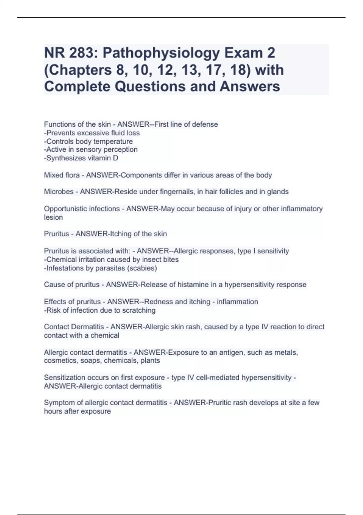 NR 283: Pathophysiology Exam 2 (Chapters 8, 10, 12, 13, 17, 18) with Complete Questions and AnswersNR 283: Pathophysiology Exam 2 (Chapters 8, 10, 12, 13, 17, 18) with Complete Questions and AnswersNR 283: Pathophysiology Exam 2 (Chapters 8, 10, 12, 13, 17, 18) with Complete Questions and AnswersNR 283: Pathophysiology Exam 2 (Chapters 8, 10, 12, 13, 17, 18) with Complete Questions and AnswersNR 283: Pathophysiology Exam 2 (Chapters 8, 10, 12, 13, 17, 18) with Complete Questions and AnswersNR 283: Pathophysiology Exam 2 (Chapters 8, 10, 12, 13, 17, 18) with Complete Questions and Answers Functions of the skin - ANSWER--First line of defense -Prevents excessive fluid loss -Controls body temperature -Active in sensory perception -Synthesizes vitamin D Mixed flora - ANSWER-Components differ in various areas of the body Microbes - ANSWER-Reside under fingernails, in hair follicles and in glands Opportunistic infections - ANSWER-May occur because of injury or other inflammatory lesion Pruritus - ANSWER-Itching of the skin Pruritus is associated with: - ANSWER--Allergic responses, type I sensitivity -Chemical irritation caused by insect bites -Infestations by parasites (scabies)