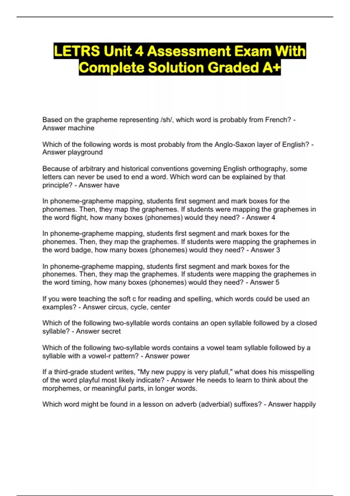 LETRS Unit 4 Assessment Exam With Complete Solution Graded A+...