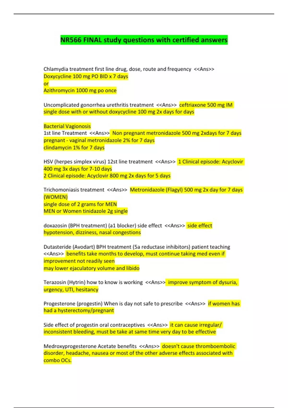 Chlamydia treatment first line drug, dose, route and frequency Ans Doxycycline 100 mg PO BID x 7 days or Azithromycin 1000 mg po once Uncomplicated gonorrhea urethritis treatment Ans ceftriaxone 500 mg IM single dose with or without doxycycline 100 mg 2x days for days Bacterial Vagionosis 1st line Treatment Ans Non pregnant metronidazole 500 mg 2xdays for 7 days pregnant - vaginal metronidazole 2% for 7 days clindamycin 1% for 7 days HSV (herpes simplex virus) 12st line treatment Ans 1 Clinical episode: Acyclovir 400 mg 3x days for 7-10 days 2 Clinical episode: Acyclovir 800 mg 2x days for 5 days Trichomoniasis treatment Ans Metronidazole (Flagyl) 500 mg 2x day for 7 days (WOMEN) single dose of 2 grams for MEN MEN or Women tinidazole 2g single doxazosin (BPH treatment) (a1 blocker) side effect Ans side effect hypotension, dizziness, nasal congestions Dutasteride (Avodart) BPH treatment (5a reductase inhibitors) patient teaching Ans benefits take months to develop, must continue taking med even if improvement not readily seen may lower ejaculatory volume and libido Terazosin (Hytrin) how to know is working Ans improve symptom of dysuria, urgency, UTI, hesitancy Progesterone (progestin) When is day not safe to prescribe Ans if women has had a hysterectomy/pregnant Side effect of progestin oral contraceptives Ans it can cause irregular/ inconsistent bleeding, must be take at same time very day to be effective Medroxyprogesterone Acetate benefits Ans doesn't cause thromboembolic disorder, headache, nausea or most of the other adverse effects associated with combo OCs. testosterone replacement therapy routes Ans administering testosterone supplement through, pill, injections, and patches. Testosterone patch patient teaching Ans wash hands after applying cover application site with clothing after the drug had dried wash the application site before skin-to-skin contact another person Androgen therapy appropriate vs. not needed related to puberty Ans Short term: The psychological pressures of delayed sexual maturation are causing a boy significant distress Long term: if delayed puberty related to true hypogonadism Side effect of testosterone replacement therapy Ans hot flashes, bone fx, decrease libido, insulin resistance, erectile dysfunction, acne, HTN, sterility, aggression, and mood swings. Alprostadil benefits of various routes: for ED Ans The injection needs to be done by the patient or in ER setting: rapidly leads to erection, painless Intraurethral pellet insertion: can be done by the patient, an erection occurs within 5-10 mins minimal side effects How does carbamazepine impact oral contraceptives and what symptoms may be associated with that? Ans accelerated OC medication and reducing OC EFFECT How might this affect which OCP is prescribed Carbamazepine Ans Increase the estrogen dosage of the OC Combine the OC with a second from a birth control Switch to an alternation form of birth control Benefits of Etonogestrel subdermal implant (Nexplanon) Ans it is one of the most effective forms of contraception, long term option is 5 years, reversible by removing rod can take with women with a hx of thrombosis · Papaverine plus phentolamine Patient Education Ans Do not inject more than once in a 24 hours period, notify provide if erection duration and efficacy, consult MD before taking new medication, seek medical attention right away if erection is 3 hours Syphilis 1st line treatment Ans Penicillin G IV