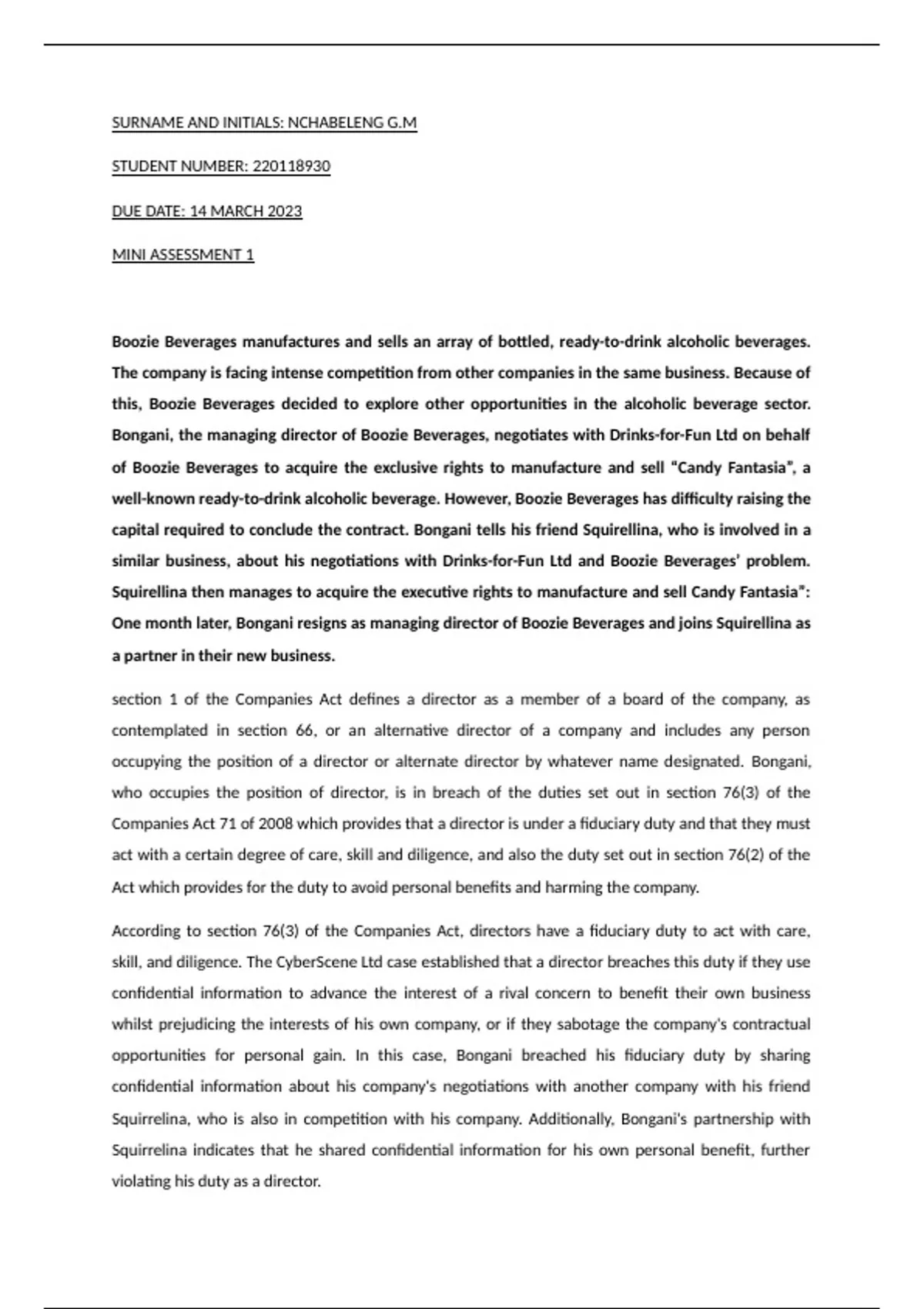 Companies Act 71 of 2008 which provides that a director is under a fiduciary duty and that they must