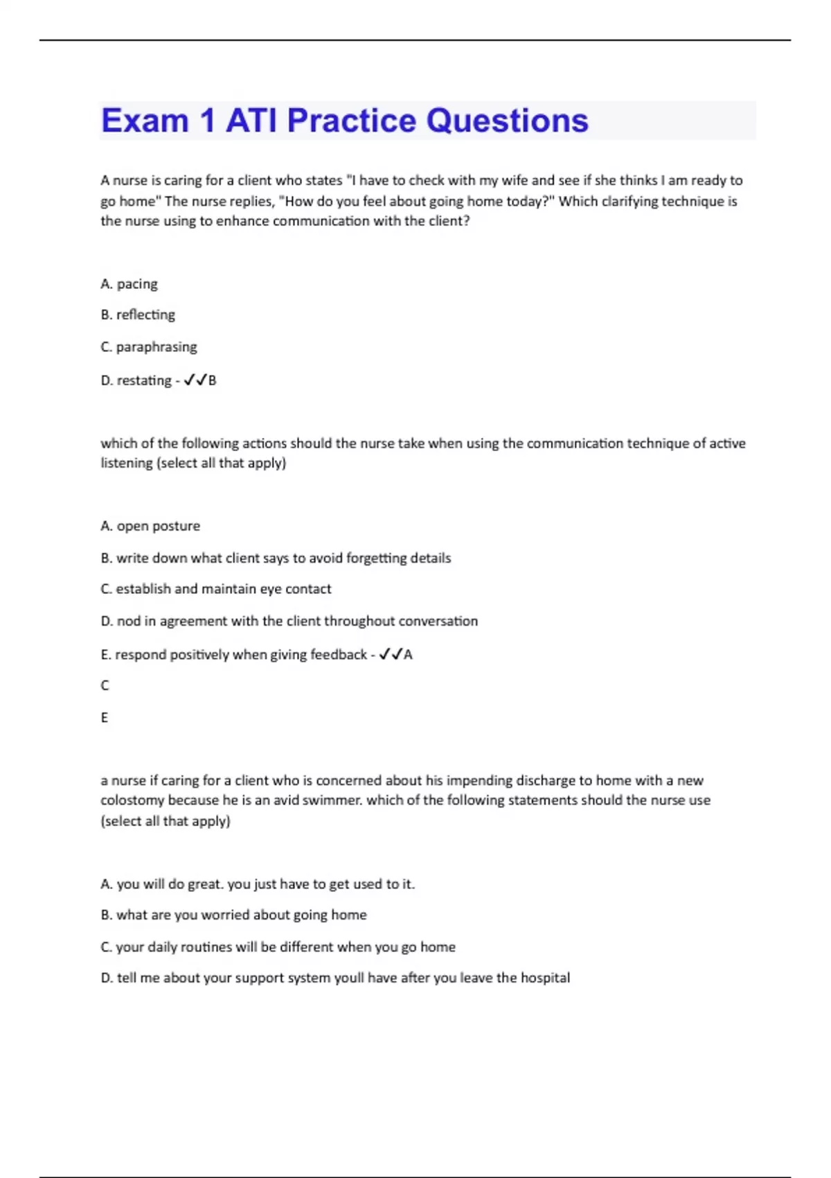 A nurse is caring for a client who states "I have to check with my wife and see if she thinks I am ready to go home" The nurse replies, "How do you feel about going home today?" Which clarifying technique is the nurse using to enhance communication with the client? A. pacing B. reflecting C. paraphrasing D. restating - B which of the following actions should the nurse take when using the communication technique of active listening (select all that apply) A. open posture B. write down what client says to avoid forgetting details C. establish and maintain eye contact D. nod in agreement with the client throughout conversation E. respond positively when giving feedback - A C E a nurse if caring for a client who is concerned about his impending discharge to home with a new colostomy because he is an avid swimmer. which of the following statements should the nurse use (select all that apply) A. you will do great. you just have to get used to it. B. what are you worried about going home C. your daily routines will be different when you go home D. tell me about your support system youll have after you leave the hospital