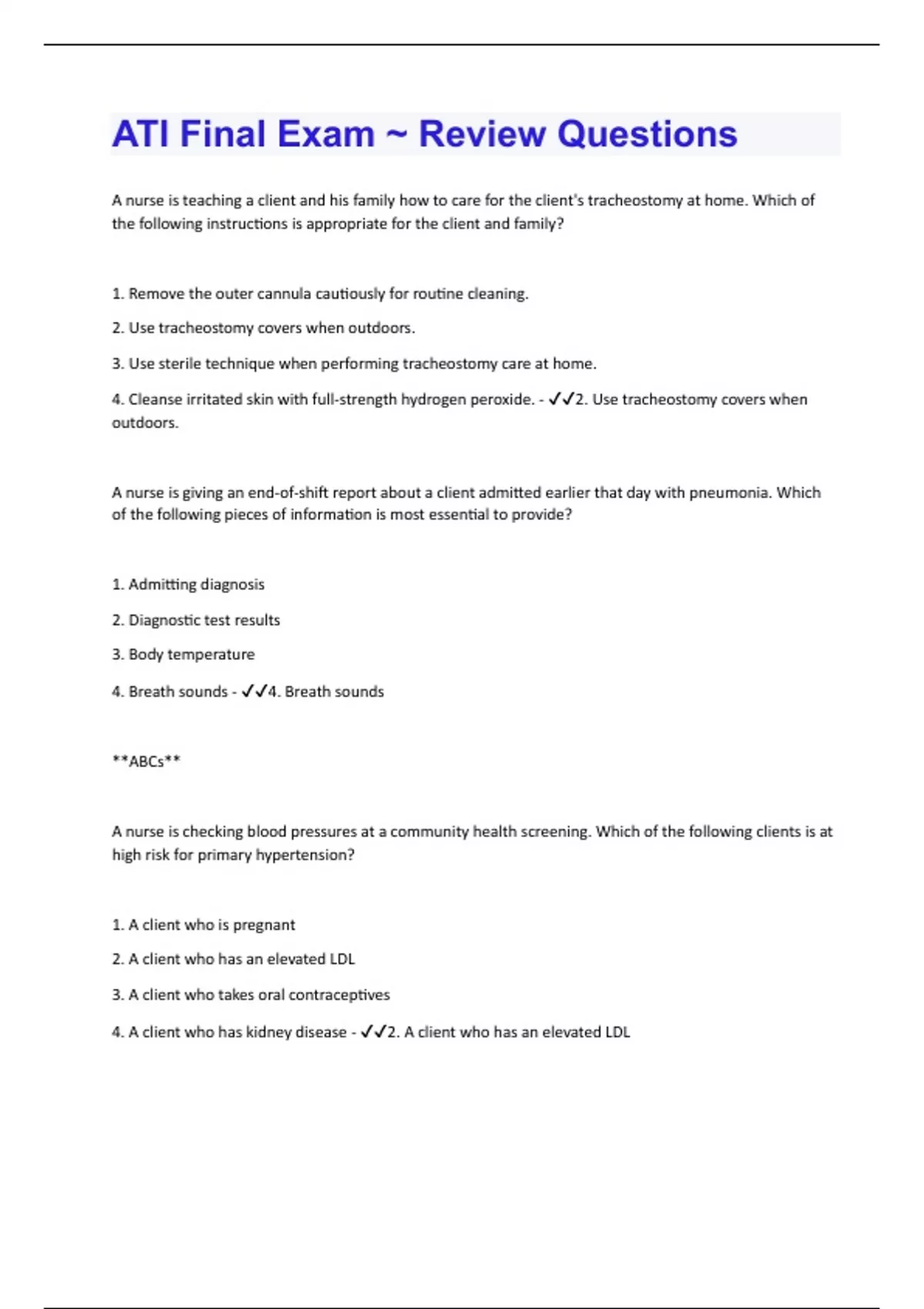 A nurse is teaching a client and his family how to care for the client's tracheostomy at home. Which of the following instructions is appropriate for the client and family? 1. Remove the outer cannula cautiously for routine cleaning. 2. Use tracheostomy covers when outdoors. 3. Use sterile technique when performing tracheostomy care at home. 4. Cleanse irritated skin with full-strength hydrogen peroxide. - 2. Use tracheostomy covers when outdoors. A nurse is giving an end-of-shift report about a client admitted earlier that day with pneumonia. Which of the following pieces of information is most essential to provide? 1. Admitting diagnosis 2. Diagnostic test results 3. Body temperature 4. Breath sounds - 4. Breath sounds **ABCs** A nurse is checking blood pressures at a community health screening. Which of the following clients is at high risk for primary hypertension? 1. A client who is pregnant 2. A client who has an elevated LDL 3. A client who takes oral contraceptives 4. A client who has kidney disease - 2. A client who has an elevated LDL